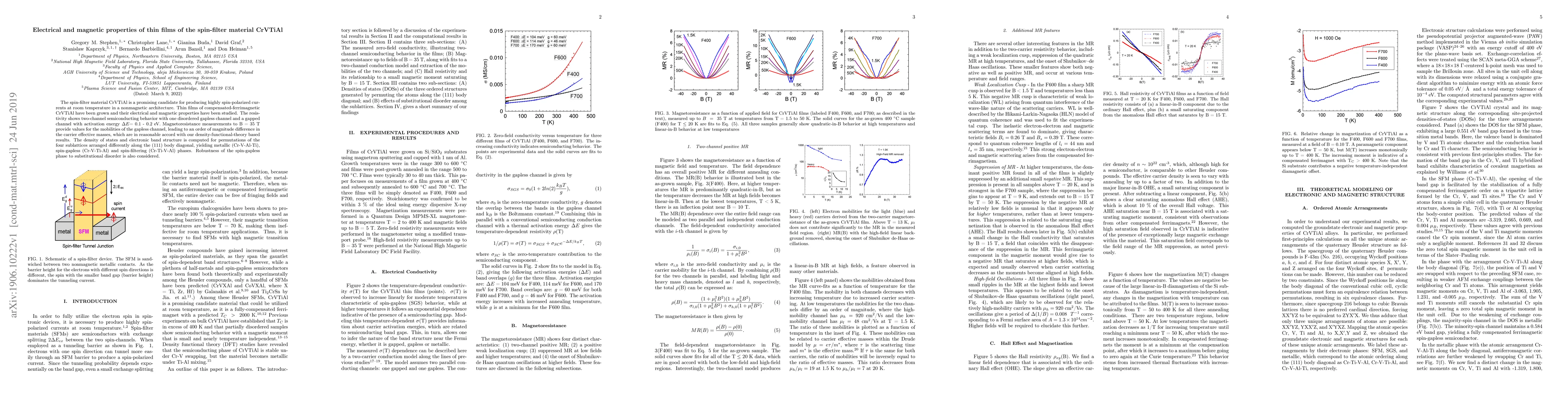 The spin-filter material CrVTiAl is a promising candidate for producing highly spin-polarized currents at room temperature in a nonmagnetic architecture. Thin films of compensated-ferrimagnetic CrVTiAl have been grown and their electrical and magnetic properties have been studied. The resistivity shows two-channel semiconducting behavior with one disordered gapless channel and a gapped channel with activation energy $\Delta E$=~0.1~-~0.2~eV. Magnetoresistance measurements to B~=~35~T provide values for the mobilities of the gapless channel, leading to an order of magnitude difference in the carrier effective masses, which are in reasonable accord with our density-functional-theory based results. The density of states and electronic band structure is computed for permutations of the four sublattices arranged differently along the (111) body diagonal, yielding metallic (Cr-V-Al-Ti), spin-gapless (Cr-V-Ti-Al) and spin-filtering (Cr-Ti-V-Al) phases. Robustness of the spin-gapless phase to substitutional disorder is also considered.