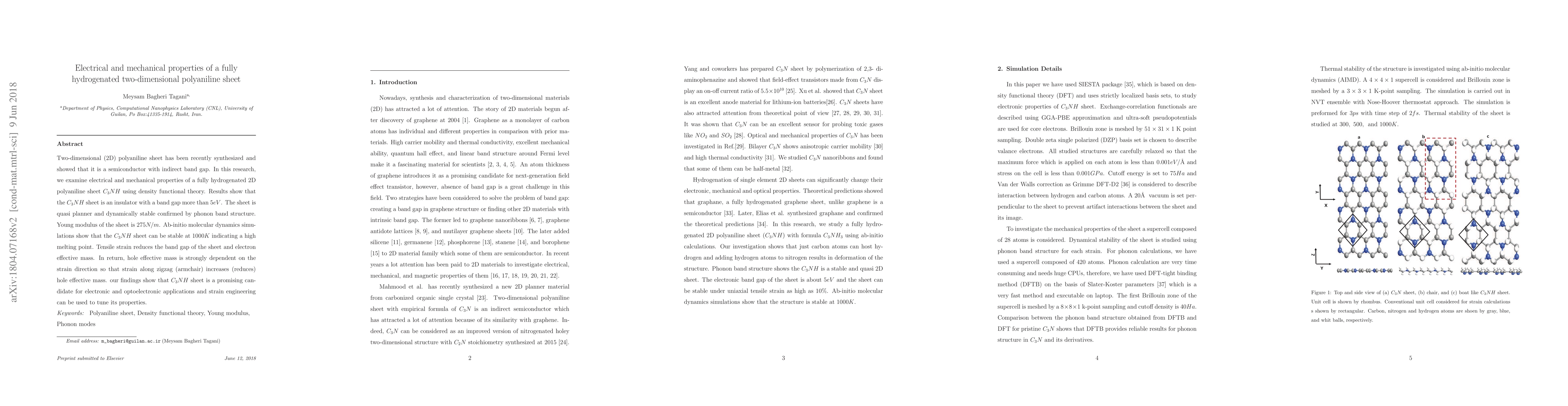 This research investigates the electrical and mechanical properties of fully hydrogenated 2D polyaniline sheet (C3NH) using density functional theory. The study finds that C3NH is an insulator with a large band gap and exhibits high mechanical stability, making it a promising material for electronic and optoelectronic applications, with tunable properties via strain engineering.