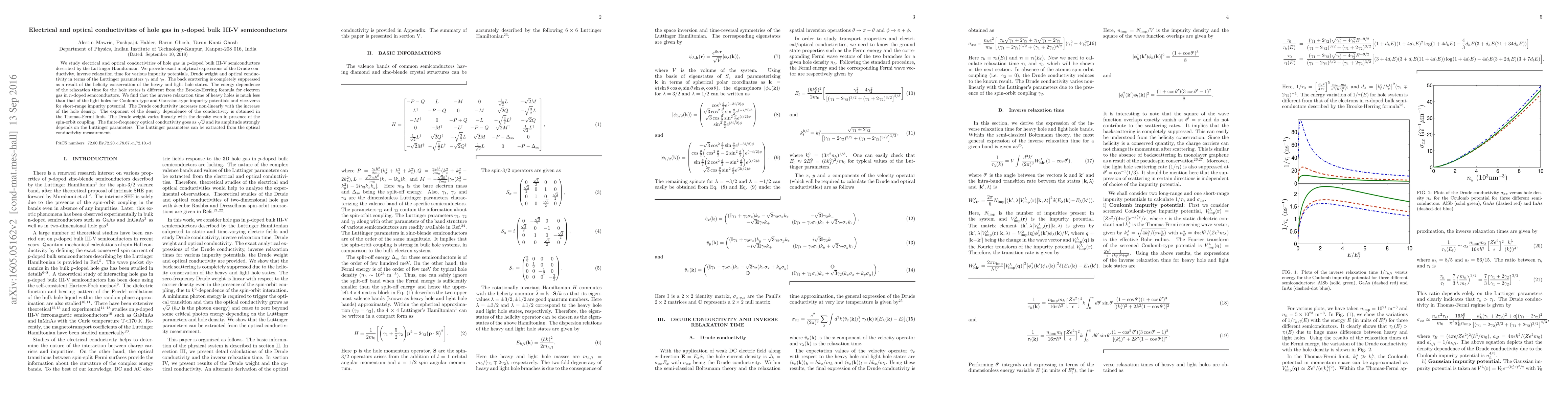 This paper investigates the electrical and optical conductivities of hole gas in $p$-doped III-V semiconductors using the Luttinger Hamiltonian, deriving analytical expressions for Drude conductivity and optical conductivity dependent on Luttinger parameters $\gamma_1$ and $\gamma_2$. It finds that the relaxation time and Drude conductivity differ for heavy and light holes based on impurity potential types, and the optical conductivity varies with frequency.