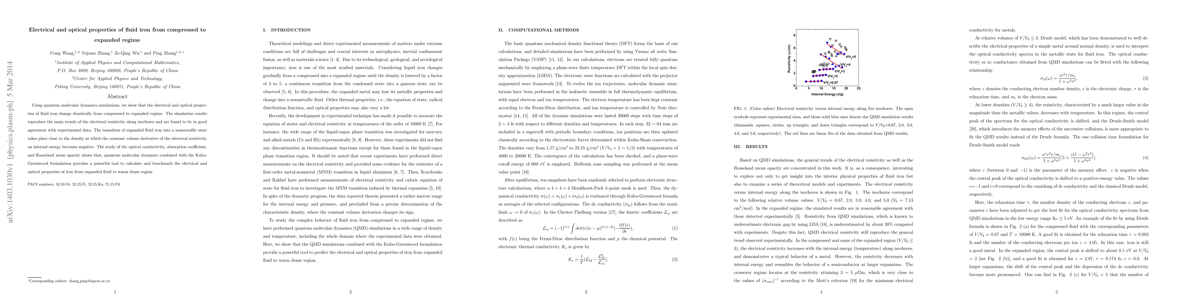Quantum molecular dynamics simulations reveal significant changes in fluid iron's electrical and optical properties from high-pressure to low-pressure states, accurately reproducing experimental data. The methodology benchmarks these properties from fluid to warm dense iron, identifying a transition to nonmetallic state near a specific density.
