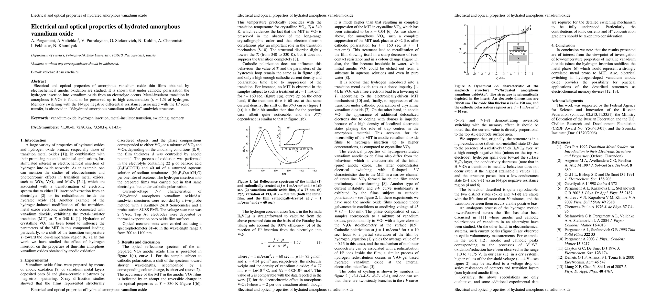 This study investigates the electrical and optical properties of hydrated amorphous vanadium oxide thin films. The research reveals that hydrogen insertion from the electrolyte during cathodic polarization preserves the metal-insulator transition up to a high hydrogen concentration, and it observes memory switching behavior associated with H+ ionic transfer in sandwich structures.
