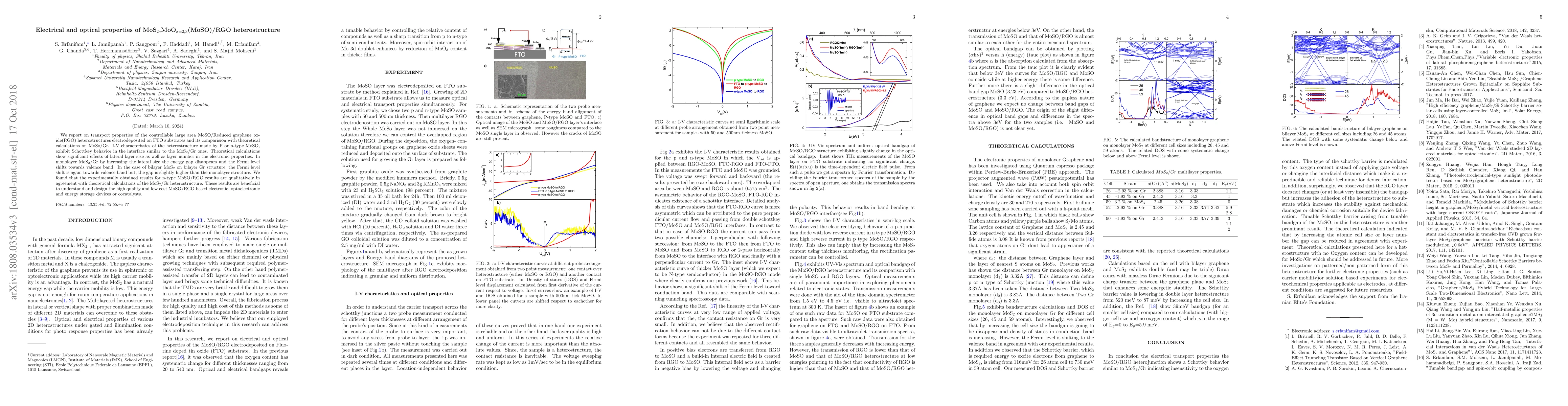 We report on transport properties of the controllable large area MoSO/Reduced graphene oxide(RGO) heterostructures electrodeposited on FTO substrates and its comparision with theoretical calculations on MoSo/Gr. I-V characteristics of the heterostructure made by P or n-type MoSO, exhibit Schottkey behavior in the interface similar to the MoS$_{2}$/Gr ones. Theoretical calculations show significant effects of lateral layer size as well as layer number in the electronic properties. In monolayer MoS$_{2}$/Gr by increasing the lateral size the energy gap disappears and the Fermi level shifts towards valence band. In the case of bilayer MoS$_{2}$ on bilayer Gr structure, the Fermi level shift is again towards valence band but, the gap is slightly higher than the monolayer structure. We found that the experimentally obtained results for n-type MoSO/RGO results are qualitatively in agreement with theoretical calculations of the MoS$_{2}$/Gr heterostructure. These results are beneficial to understand and design the high quality and low cost MoSO/RGO based electronic, optoelectronic and energy storage devices or cocatalysts.