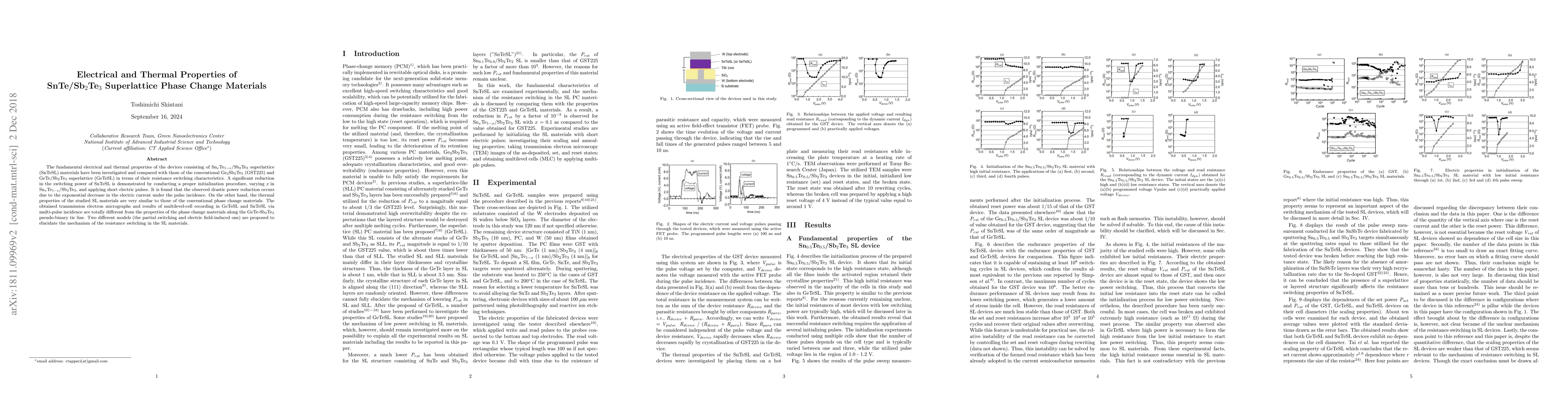 This paper investigates the electrical and thermal properties of SnTe/Sb2Te3 superlattice materials, demonstrating a significant reduction in switching power through specific initialization and pulse techniques. The thermal properties remain similar to conventional phase change materials, while the resistance switching mechanism is explained through two proposed models.