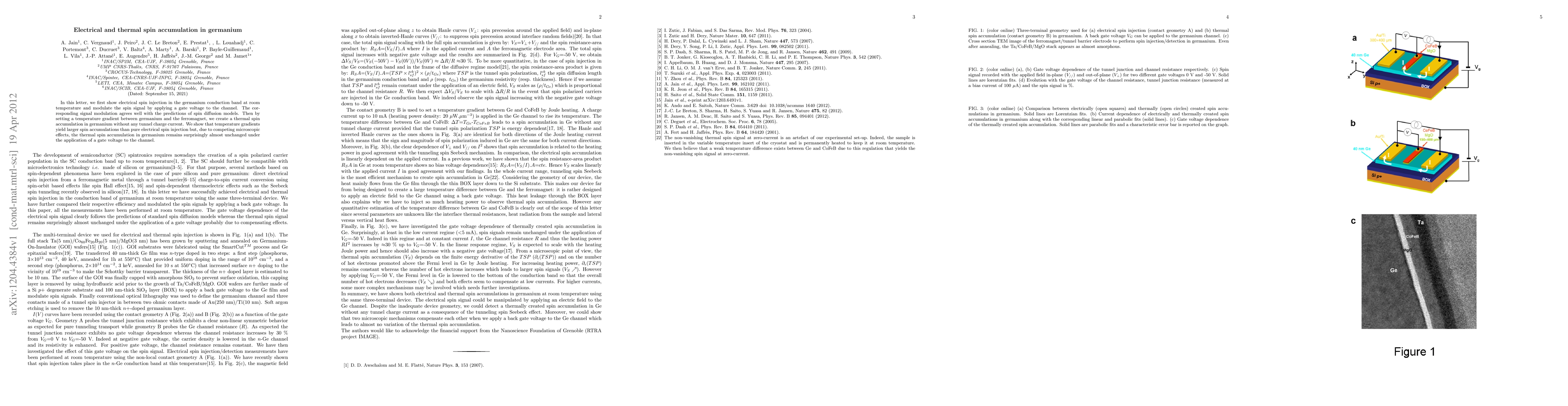 This paper demonstrates electrical spin injection in germanium's conduction band at room temperature and modulates the spin signal with a gate voltage. It also creates thermal spin accumulation through temperature gradients, finding that thermal effects yield larger spin accumulations but remain largely unaffected by gate voltages.