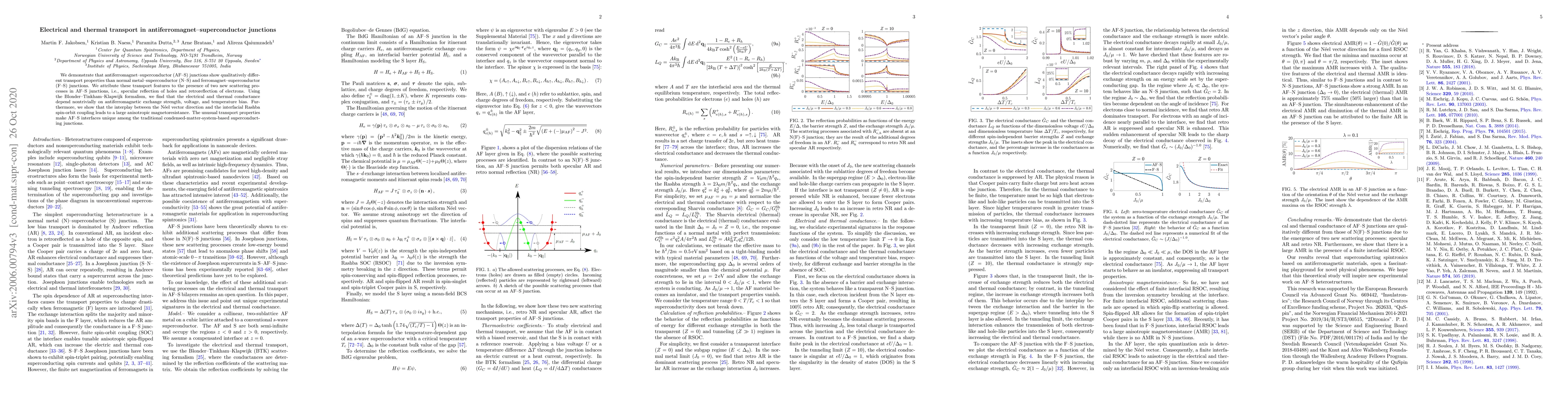 This paper investigates the distinct electrical and thermal transport properties in antiferromagnet-superconductor junctions compared to normal metal-superconductor and ferromagnet-superconductor junctions, attributing these differences to new scattering processes. The study reveals significant dependence of conductance on antiferromagnetic exchange strength and large anisotropic magnetoresistance due to the interplay of N\'eel vector and Rashba spin-orbit coupling.