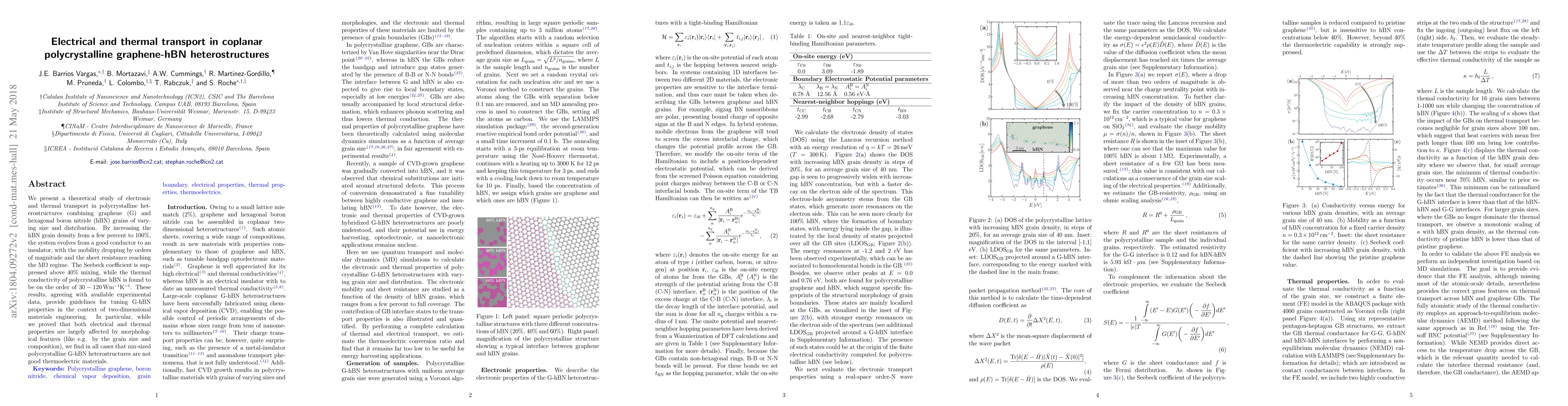 This research investigates electronic and thermal transport in polycrystalline graphene-hBN heterostructures, finding that increased hBN grain density transforms the system from a conductor to an insulator, while suppressing the Seebeck coefficient and reducing thermal conductivity. The study concludes that nm-sized heterostructures are not suitable thermoelectric materials.