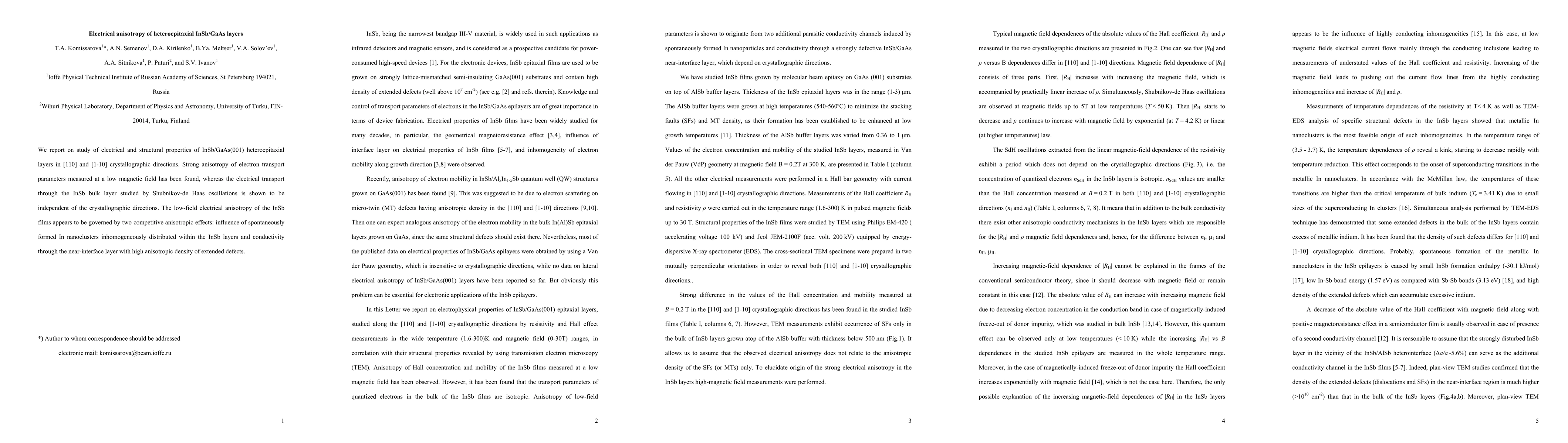 This study investigates the electrical anisotropy in heteroepitaxial InSb/GaAs layers, revealing significant anisotropy in electron transport along different crystallographic directions, while bulk InSb transport remains directionally independent. The observed anisotropy is attributed to the influence of In nanoclusters and a high-defect density near the interface.