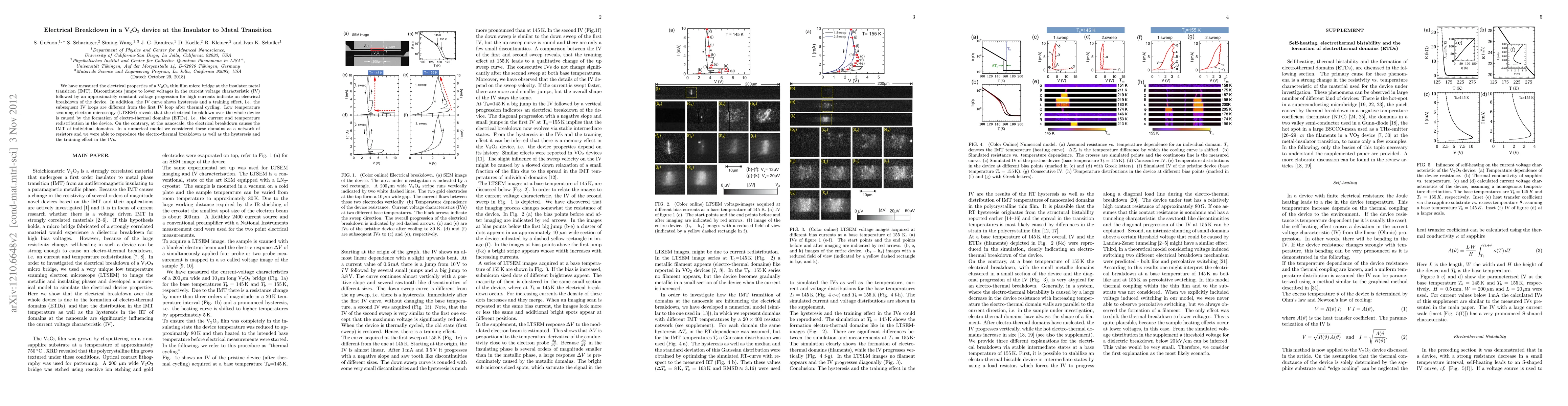 We have measured the electrical properties of a V2O3 thin film micro bridge at the insulator metal transition (IMT). Discontinuous jumps to lower voltages in the current voltage characteristic (IV) followed by an approximately constant voltage progression for high currents indicate an electrical breakdown of the device. In addition, the IV curve shows hysteresis and a training effect, i.e. the subsequent IV loops are different from the first IV loop after thermal cycling. Low temperature scanning electron microscopy (LTSEM) reveals that the electrical breakdown over the whole device is caused by the formation of electro-thermal domains (ETDs), i.e. the current and temperature redistribution in the device. On the contrary, at the nanoscale, the electrical breakdown causes the IMT of individual domains. In a numerical model we considered these domains as a network of resistors and we were able to reproduce the electro-thermal breakdown as well as the hysteresis and the training effect in the IVs.
