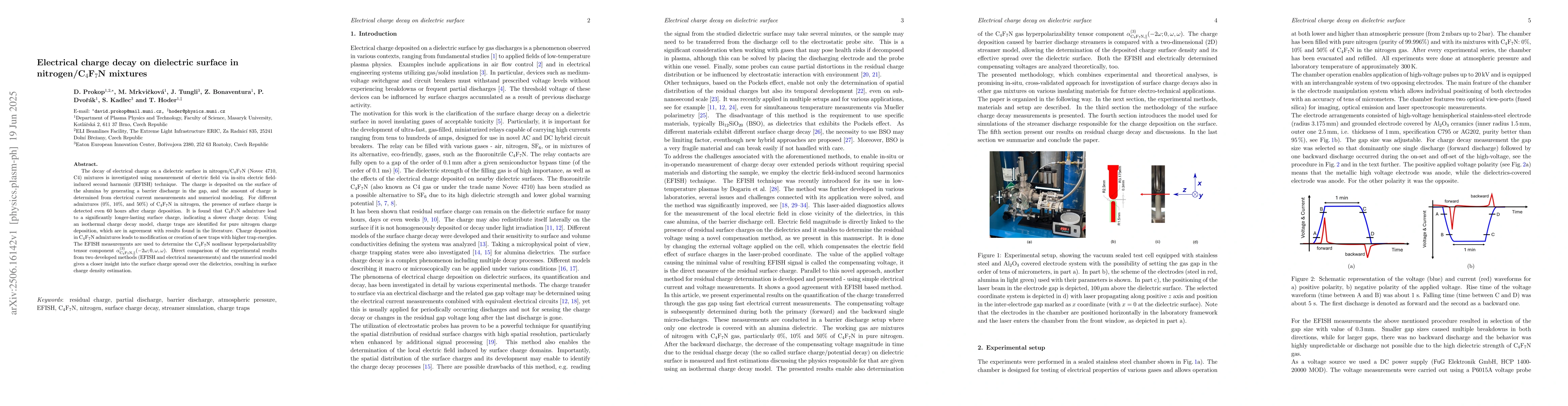 The decay of electrical charge on a dielectric surface in nitrogen-C4F7N (Novec4710, C4) mixtures is investigated using measurement of electric field via in-situ electric field-induced second harmonic (EFISH) technique. The charge is deposited on the surface of the alumina by generating a barrier discharge in the gap, and the amount of charge is determined from electrical current measurements and numerical modeling. For different admixtures (0, 10, and 50 percent) of C4F7N in nitrogen, the presence of surface charge is detected even 60 hours after charge deposition. It is found that C4F7N admixture lead to a significantly longer-lasting surface charge, indicating a slower charge decay. Using an isothermal charge decay model, charge traps are identified for pure nitrogen charge deposition, which are in agreement with results found in the literature. Charge deposition in C4F7N admixtures leads to modification or creation of new traps with higher trap energies. The EFISH measurements are used to determine the C4F7N nonlinear hyperpolarizability tensor component. Direct comparison of the experimental results from two developed methods (EFISH and electrical measurements) and the numerical model gives a closer insight into the surface charge spread over the dielectrics, resulting in surface charge density estimation.