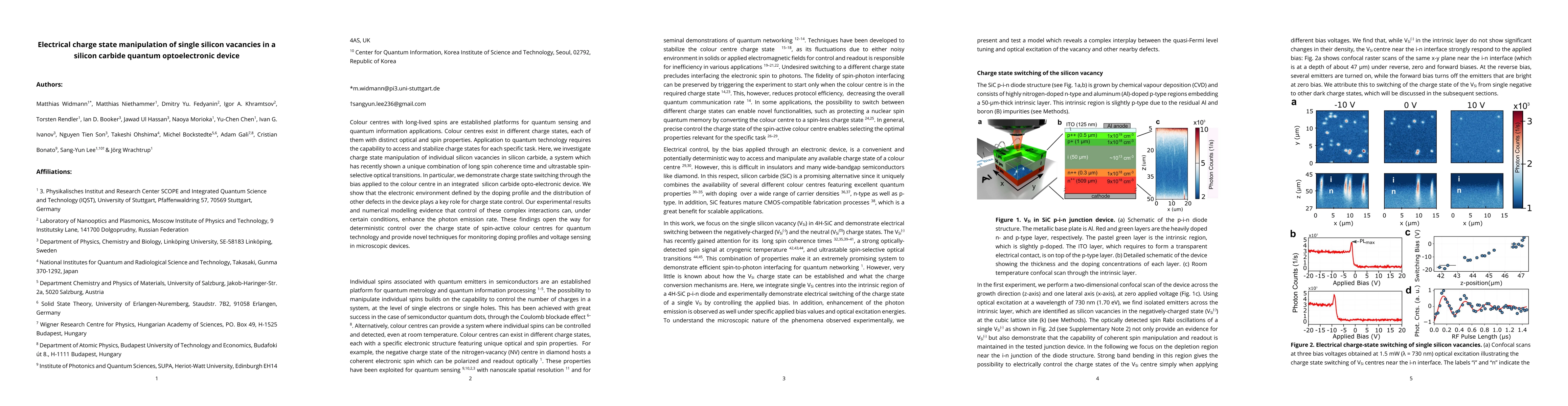 This research investigates the manipulation of charge states in individual silicon vacancies in silicon carbide quantum optoelectronic devices, demonstrating charge state switching via applied bias. The study highlights the importance of electronic environment and defect distribution for charge state control, revealing enhanced photon emission under specific conditions, which could advance quantum technology and enable monitoring of doping profiles and voltage sensing.