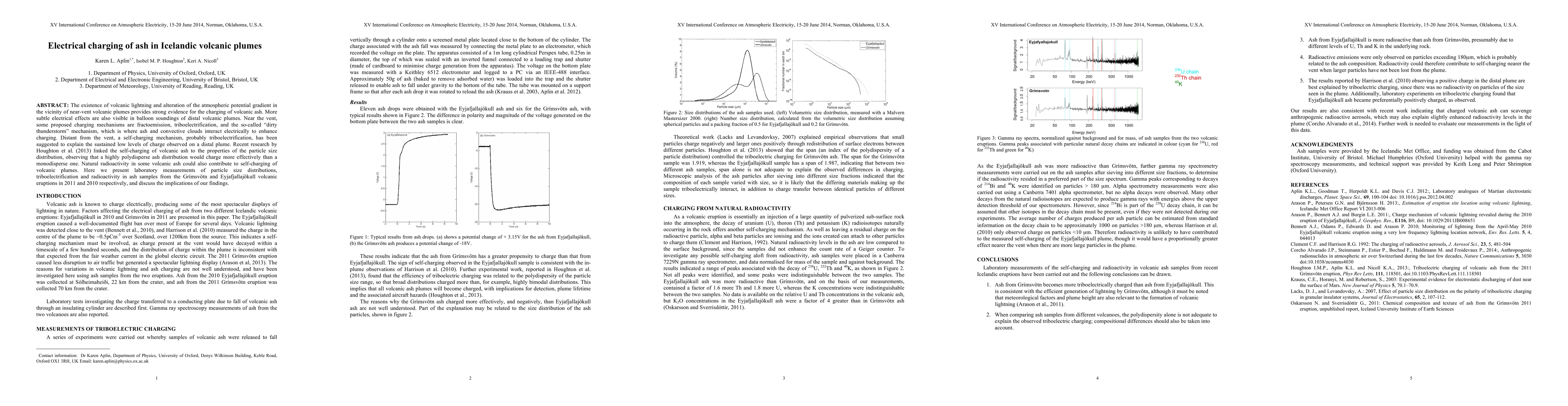 This research investigates the electrical charging of ash in Icelandic volcanic plumes, identifying mechanisms like fractoemission and triboelectrification near the vent and self-charging at greater distances. Laboratory measurements of ash from the 2010 Eyjafjallajökull and 2011 Grímsvötn eruptions reveal the influence of particle size distribution and natural radioactivity on ash charging.