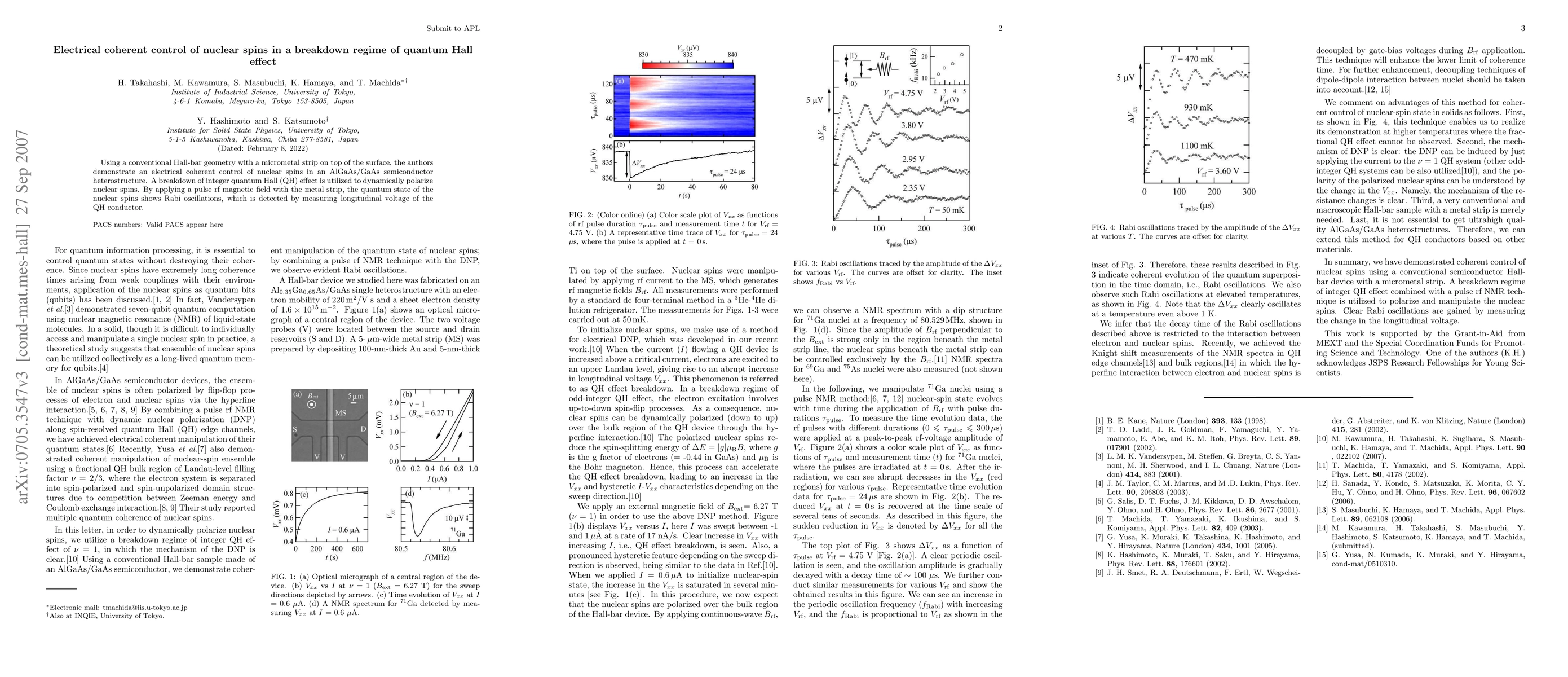 This paper demonstrates electrical coherent control of nuclear spins in an AlGaAs/GaAs heterostructure using a conventional Hall-bar geometry, leveraging a breakdown in the integer quantum Hall effect to dynamically polarize the spins. Rabi oscillations are observed via a pulse rf magnetic field, detected through the longitudinal voltage of the QH conductor.