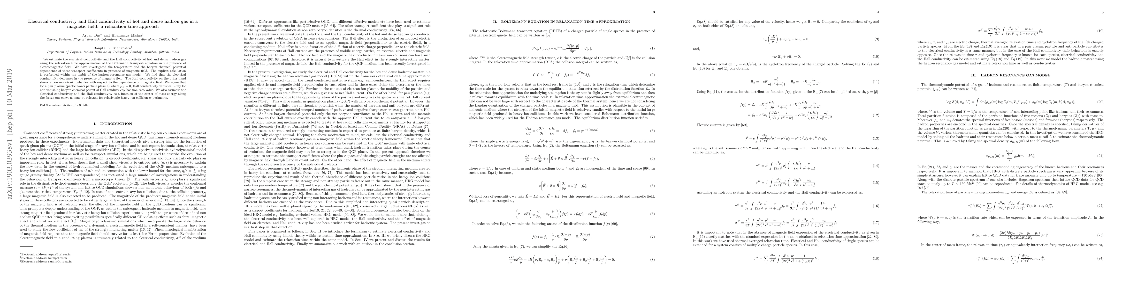 This paper estimates electrical and Hall conductivities in a hot, dense hadron gas under a magnetic field using the relaxation time approximation. It reveals that electrical conductivity decreases with magnetic field, while Hall conductivity exhibits non-monotonic behavior, being zero in a pair plasma but non-zero with non-vanishing baryon chemical potential.