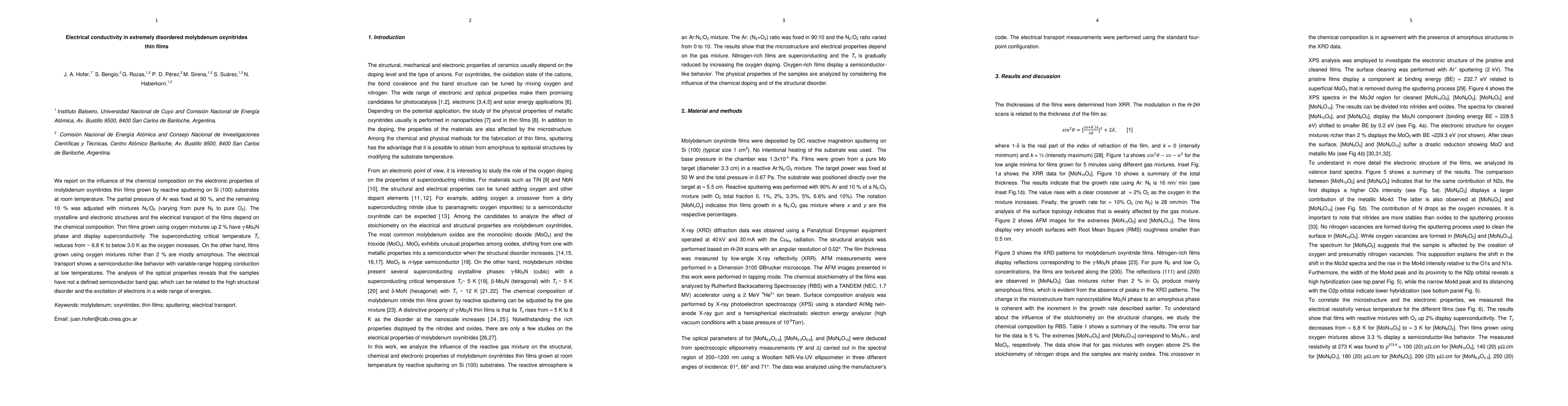 We report on the influence of the chemical composition on the electronic properties of molybdenum oxynitrides thin films grown by reactive sputtering on Si (100) substrates at room temperature. The partial pressure of Ar was fixed at 90 %, and the remaining 10 % was adjusted with mixtures N$_2$:O$_2$ (varying from pure N$_2$ to pure O$_2$). The crystalline and electronic structures and the electrical transport of the films depend on the chemical composition. Thin films grown using oxygen mixtures up 2 % have gamma-Mo$_2$N phase and display superconductivity. The superconducting critical temperature T$_c$ reduces from ~ 6.8 K to below 3.0 K as the oxygen increases. On the other hand, films grown using oxygen mixtures richer than 2 % are mostly amorphous. The electrical transport shows a semiconductor-like behavior with variable-range hopping conduction at low temperatures. The analysis of the optical properties reveals that the samples have not a defined semiconductor band gap, which can be related to the high structural disorder and the excitation of electrons in a wide range of energies