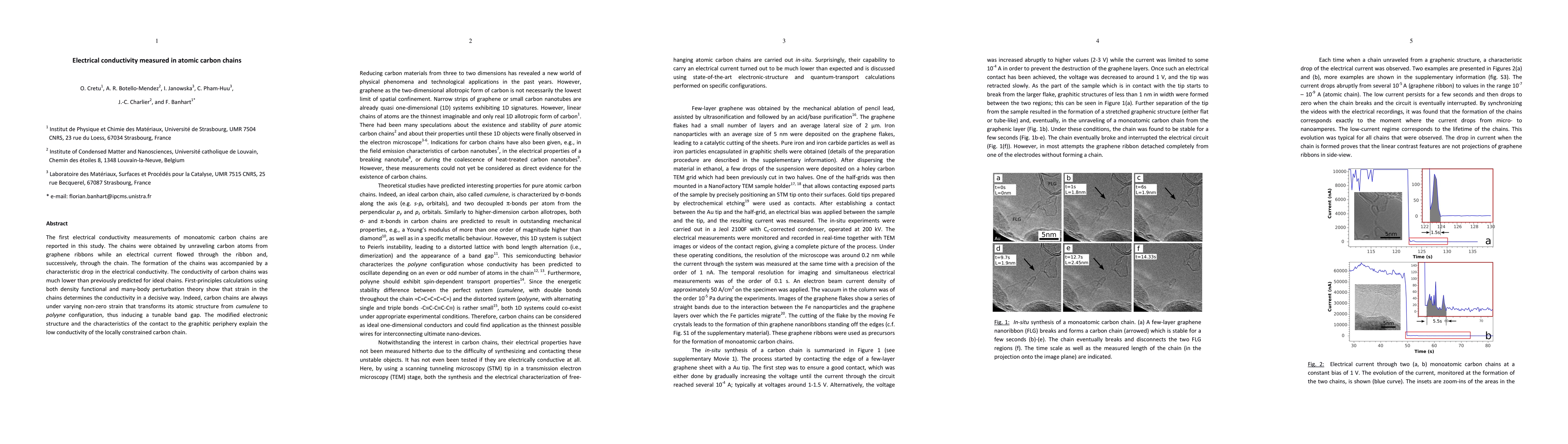 This study reports the first electrical conductivity measurements of monoatomic carbon chains formed by unraveling graphene ribbons, revealing significantly lower conductivity than predicted. Strain in the chains, transforming their structure and inducing a tunable band gap, explains the observed low conductivity.