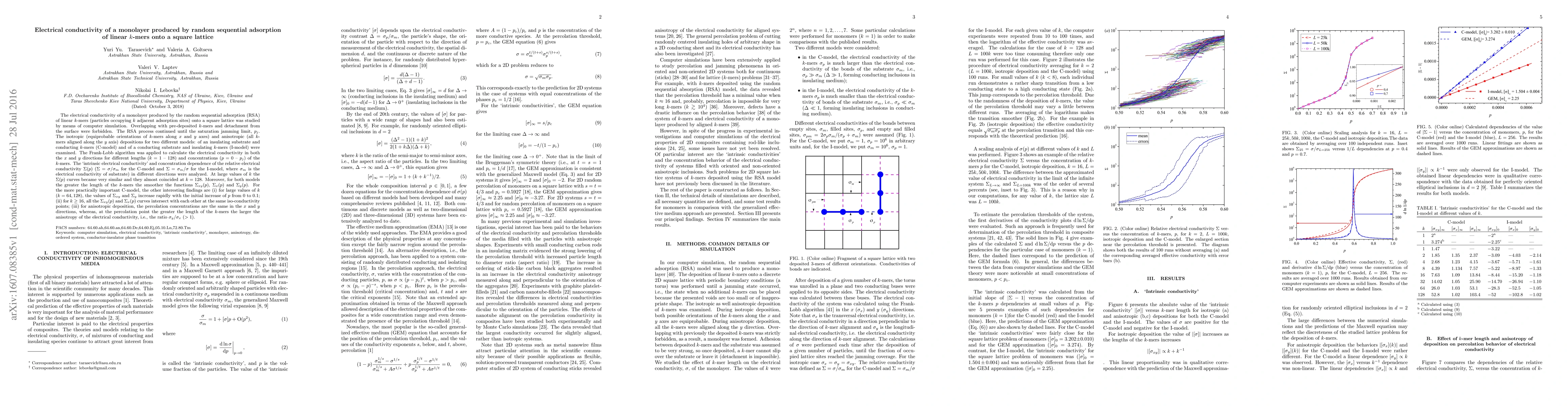 The electrical conductivity of a monolayer produced by the random sequential adsorption (RSA) of linear $k$-mers onto a square lattice was studied by means of computer simulation. Overlapping with pre-deposited $k$-mers and detachment from the surface were forbidden. The RSA continued until the saturation jamming limit, $p_j$. The isotropic and anisotropic depositions for two different models: of an insulating substrate and conducting $k$-mers (C-model) and of a conducting substrate and insulating $k$-mers (I-model) were examined. The Frank-Lobb algorithm was applied to calculate the electrical conductivity in both the $x$ and $y$ directions for different lengths ($k=1$ -- $128 $) and concentrations ($p=0$ -- $p_j$) of the $k$-mers. The `intrinsic electrical conductivity' and concentration dependence of the relative electrical conductivity $\Sigma (p)$ ($\Sigma=\sigma/ \sigma_m$ for the C-model and $\Sigma=\sigma_m /\sigma$ for the I-model, where $\sigma_m$ is the electrical conductivity of substrate) in different directions were analyzed. At large values of $k$ the $\Sigma (p)$ curves became very similar and they almost coincided at $k=128$. Moreover, for both models the greater the length of the $k$-mers the smoother the functions $\Sigma_{xy}(p)$, $\Sigma_{x}(p)$ and $\Sigma_{y}(p)$. For the C-model, the other interesting findings are: for large values of $k$ ($k=64, 128$), the values of $\Sigma_{xy}$ and $\Sigma_{y}$ increase rapidly with the initial increase of $p$ from 0 to 0.1; for $k \geq 16$, all the $\Sigma_{xy}(p)$ and $\Sigma_{x}(p)$ curves intersect with each other at the same iso-conductivity points; for anisotropic deposition, the percolation concentrations are the same in the $x$ and $y$ directions, whereas, at the percolation point the greater the length of the $k$-mers the larger the anisotropy of the electrical conductivity, i.e., the ratio $\sigma_y/\sigma_x$ ($>1$).
