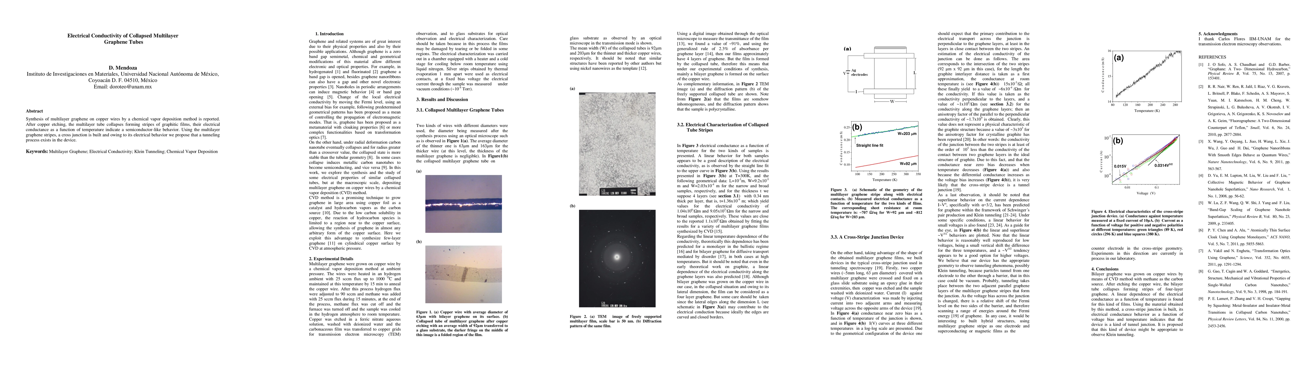 Synthesis of multilayer graphene on copper wires by a chemical vapor deposition method is reported. After copper etching, the multilayer tube collapses forming stripes of graphitic films, their electrical conductance as a function of temperature indicate a semiconductor-like behavior. Using the multilayer graphene stripes, a cross junction is built and owing to its electrical behavior we propose that a tunneling process exists in the device.