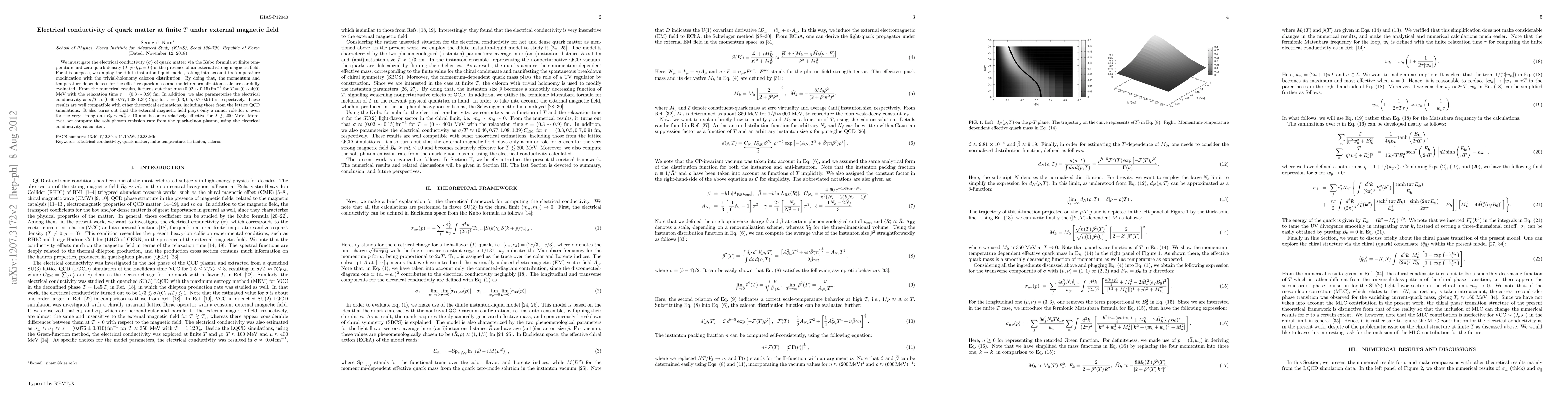 We investigate the electrical conductivity (sigma) of quark matter via the Kubo formula at finite temperature and zero quark density (T>0, mu=0) in the presence of an external strong magnetic field. For this purpose, we employ the dilute instanton-liquid model, taking into account its temperature modification with the trivial-holonomy caloron distribution. By doing that, the momentum and temperature dependences for the effective quark mass and model renormalization scale are carefully evaluated. From the numerical results, it turns out that sigma\approx(0.02 ~ 0.15)/fm for T=(0 ~ 400) MeV with the relaxation time tau=(0.3 ~ 0.9) fm. In addition, we also parameterize the electrical conductivity as sigma/T ~ (0.46,0.77,1.08,1.39)C_EM for tau=(0.3,0.5,0.7,0.9) fm, respectively. These results are well compatible with other theoretical estimations, including those from the lattice QCD simulations. It also turns out that the external magnetic field plays only a minor role for sigma even for the very strong one B_0 ~ m^2_pi*10 and becomes relatively effective for T\lesssim200 MeV. Moreover, we compute the soft photon emission rate from the quark-gluon plasma, using the electrical conductivity calculated.