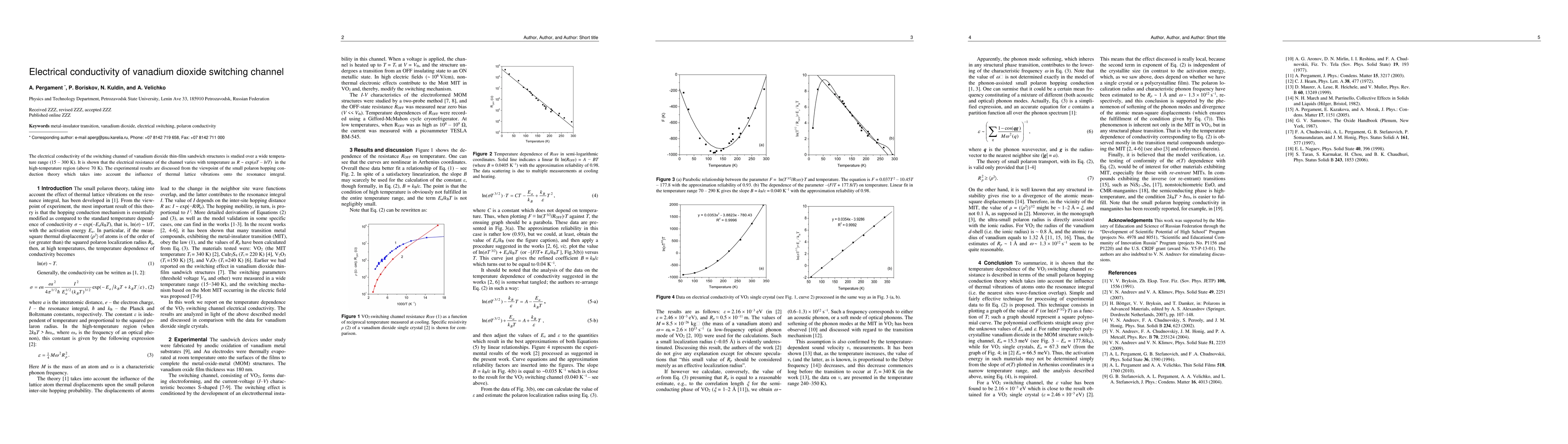 The electrical conductivity of the switching channel of vanadium dioxide thin-film sandwich structures is studied over a wide temperature range (15-300 K). It is shown that the electrical resistance of the channel varies with temperature as R~exp(aT-b/T) in the high-temperature region (above 70 K). The experimental results are discussed from the viewpoint of the small polaron hopping conduction theory which takes into account the influence of thermal lattice vibrations onto the resonance integral.