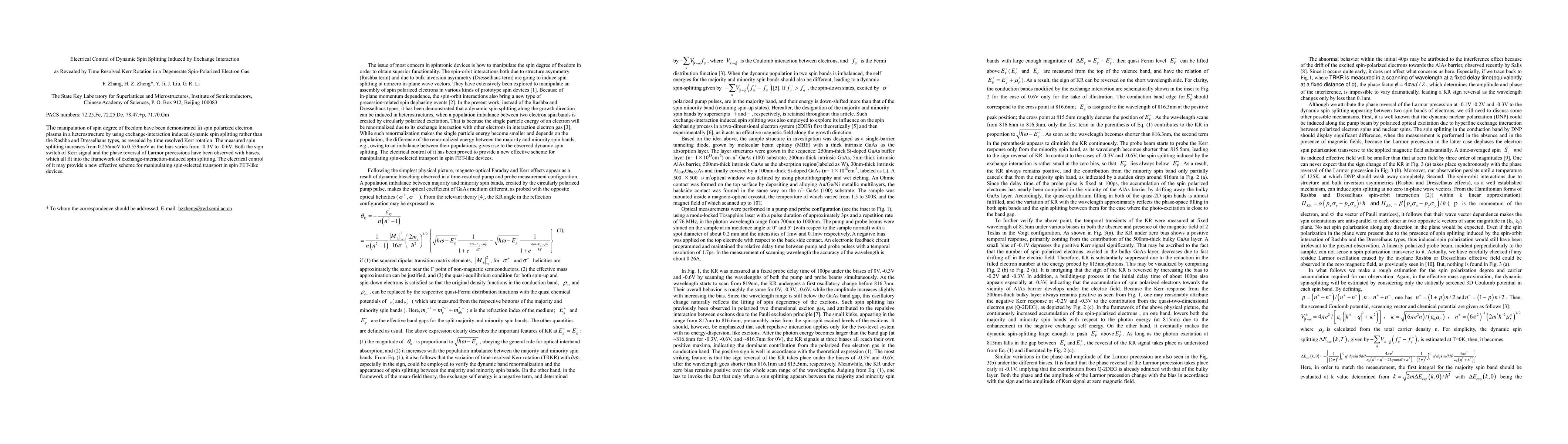 Researchers demonstrated electrical control of dynamic spin splitting in a heterostructure using exchange interaction-induced spin splitting, observed through time-resolved Kerr rotation. This finding may enable new schemes for manipulating spin-selected transport in spin FET-like devices.