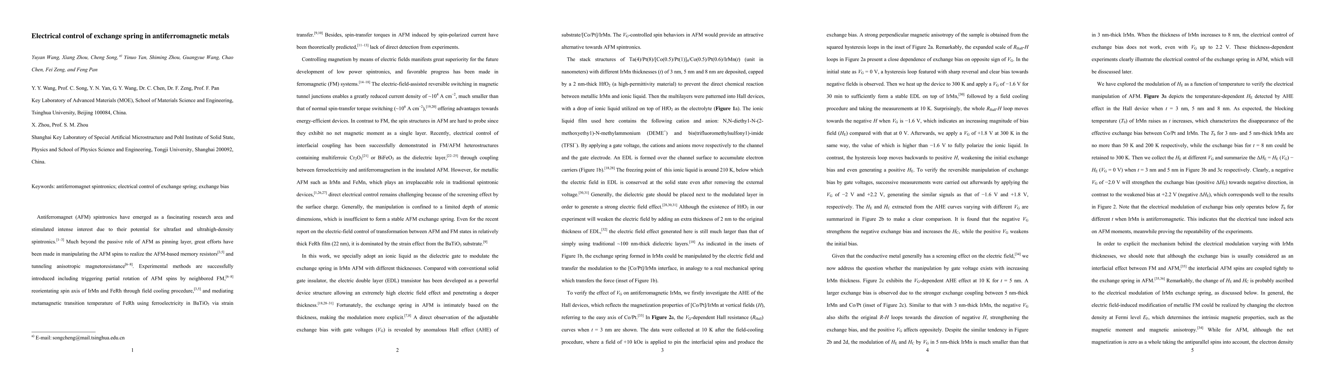 This paper reports a method for the reversible electrical control of exchange spring in antiferromagnetic metals using an ionic liquid to achieve a substantial electric-field effect, enabling deeper modulation depths and advancing the development of low-power AFM spintronics. The technique demonstrates successful manipulation in [Co/Pt]/IrMn systems and single IrMn layers up to 5 nm thick.