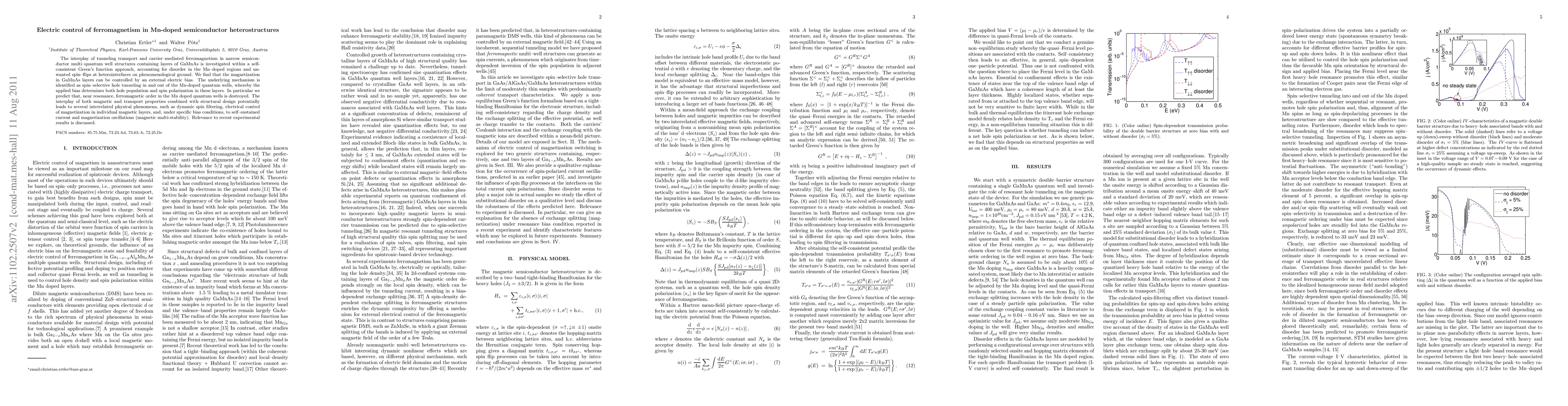 The interplay of tunneling transport and carrier-mediated ferromagnetism in narrow semiconductor multi-quantum well structures containing layers of GaMnAs is investigated within a self-consistent Green's function approach, accounting for disorder in the Mn--doped regions and unwanted spin-flips at heterointerfaces on phenomenological ground. We find that the magnetization in GaMnAs layers can be controlled by an external electric bias. The underlying mechanism is identified as spin-selective hole tunneling in and out of the Mn-doped quantum wells, whereby the applied bias determines both hole population and spin polarization in these layers. In particular we predict that, near resonance, ferromagnetic order in the Mn doped quantum wells is destroyed. The interplay of both magnetic and transport properties combined with structural design potentially leads to several interrelated physical phenomena, such as dynamic spin filtering, electrical control of magnetization in individual magnetic layers, and, under specific bias conditions, to self-sustained current and magnetization oscillations (magneticmulti-stability). Relevance to recent experimental results is discussed.