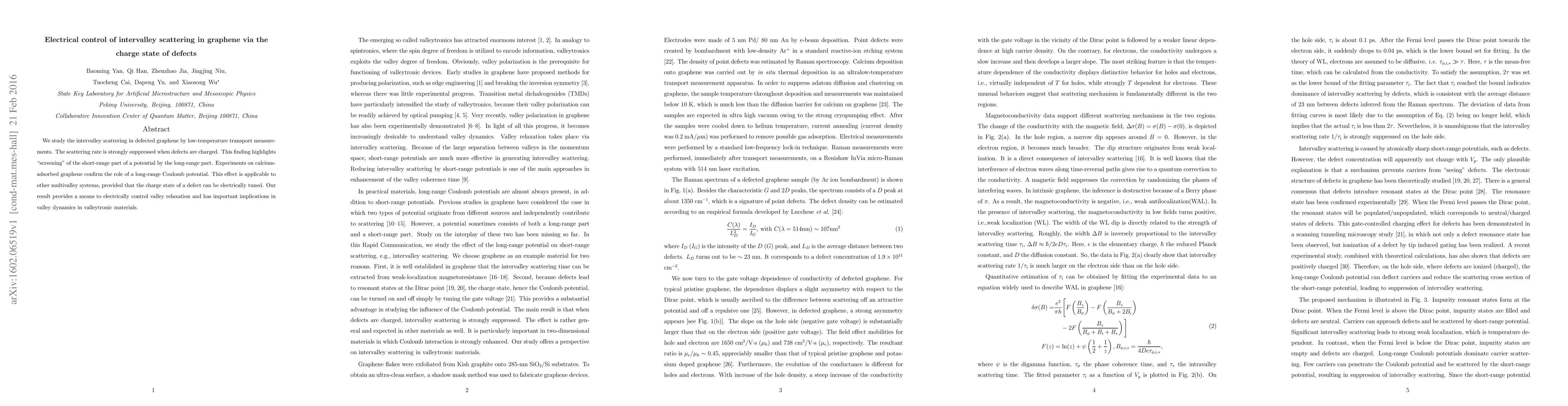 We study the intervalley scattering in defected graphene by low-temperature transport measurements. The scattering rate is strongly suppressed when defects are charged. This finding highlights "screening" of the short-range part of a potential by the long-range part. Experiments on calcium-adsorbed graphene confirm the role of a long-range Coulomb potential. This effect is applicable to other multivalley systems, provided that the charge state of a defect can be electrically tuned. Our result provides a means to electrically control valley relaxation and has important implications in valley dynamics in valleytronic materials.