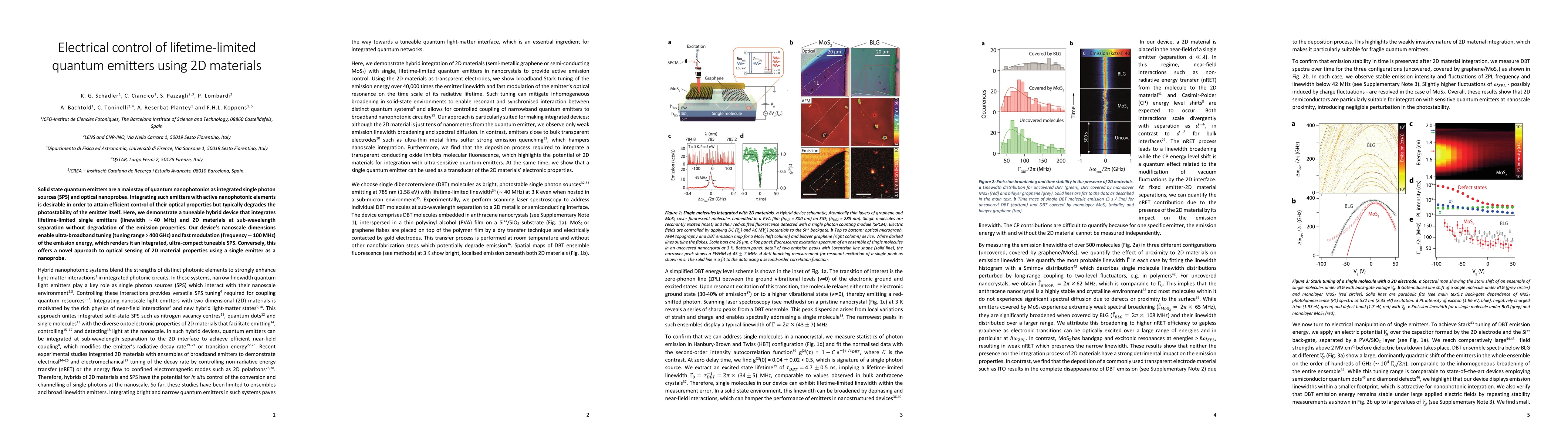 This research demonstrates a hybrid device integrating lifetime-limited quantum emitters with 2D materials, achieving ultra-broadband tuning and fast modulation without degrading emission properties. The nanoscale device serves as an ultra-compact, tuneable single photon source and a nanoprobe for optical sensing of 2D material properties.