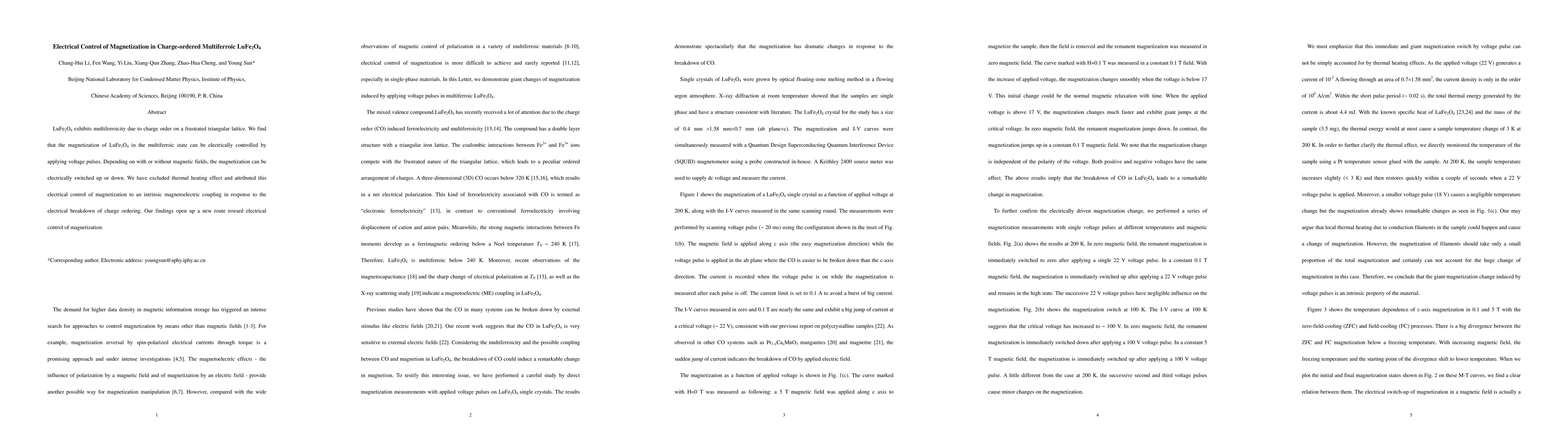 LuFe2O4 demonstrates multiferroicity via charge order on a triangular lattice, and its magnetization can be electrically controlled by voltage pulses, excluding thermal effects and attributing the control to intrinsic magnetoelectric coupling due to charge ordering breakdown. This discovery provides a new pathway for electrical manipulation of magnetization.
