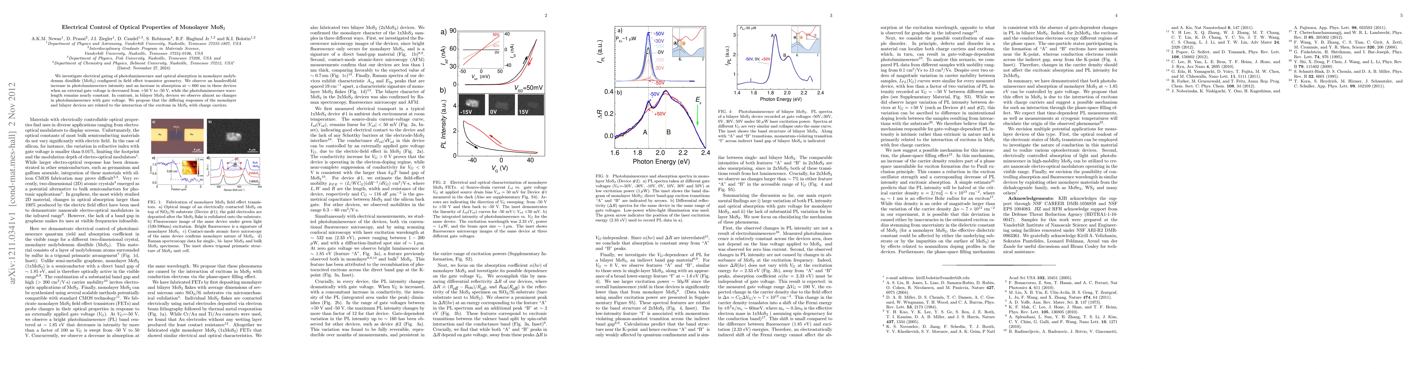 We investigate electrical gating of photoluminescence and optical absorption in monolayer molybdenum disulfide (MoS$_2$) configured in field effect transistor geometry. We observe an hundredfold increase in photoluminescence intensity and an increase in absorption at ~660 nm in these devices when an external gate voltage is decreased from +50 V to -50 V, while the photoluminescence wavelength remains nearly constant. In contrast, in bilayer MoS$_2$ devices we observe almost no changes in photoluminescence with gate voltage. We propose that the differing responses of the monolayer and bilayer devices are related to the interaction of the excitons in MoS$_2$ with charge carriers.