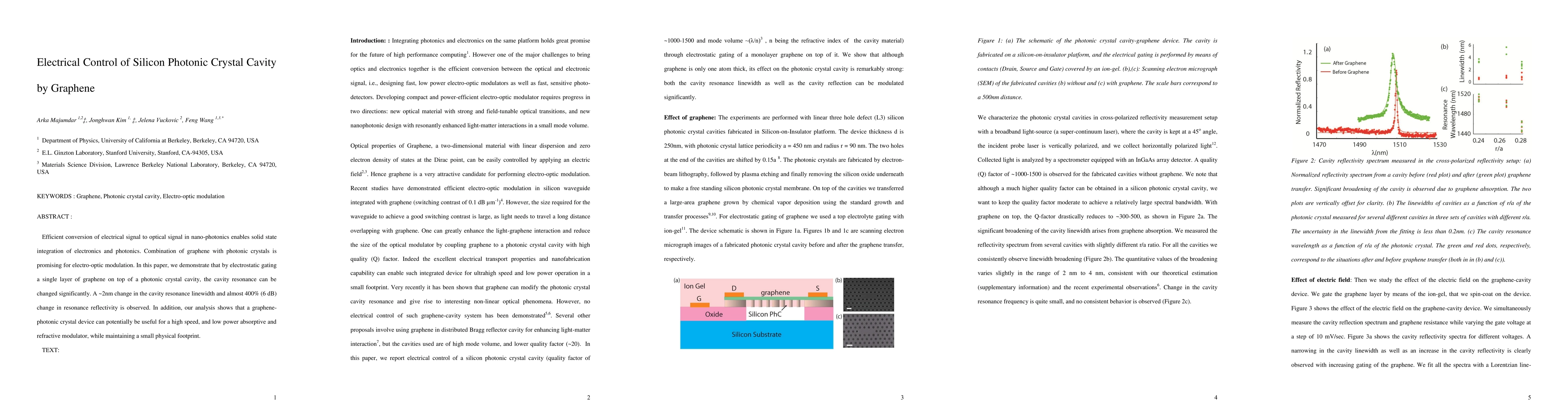 This paper demonstrates the electrical control of a silicon photonic crystal cavity via graphene, achieving a ~2nm change in resonance linewidth and a 400% increase in reflectivity through electrostatic gating. The study suggests potential for high-speed, low-power, and compact electro-optic modulators.