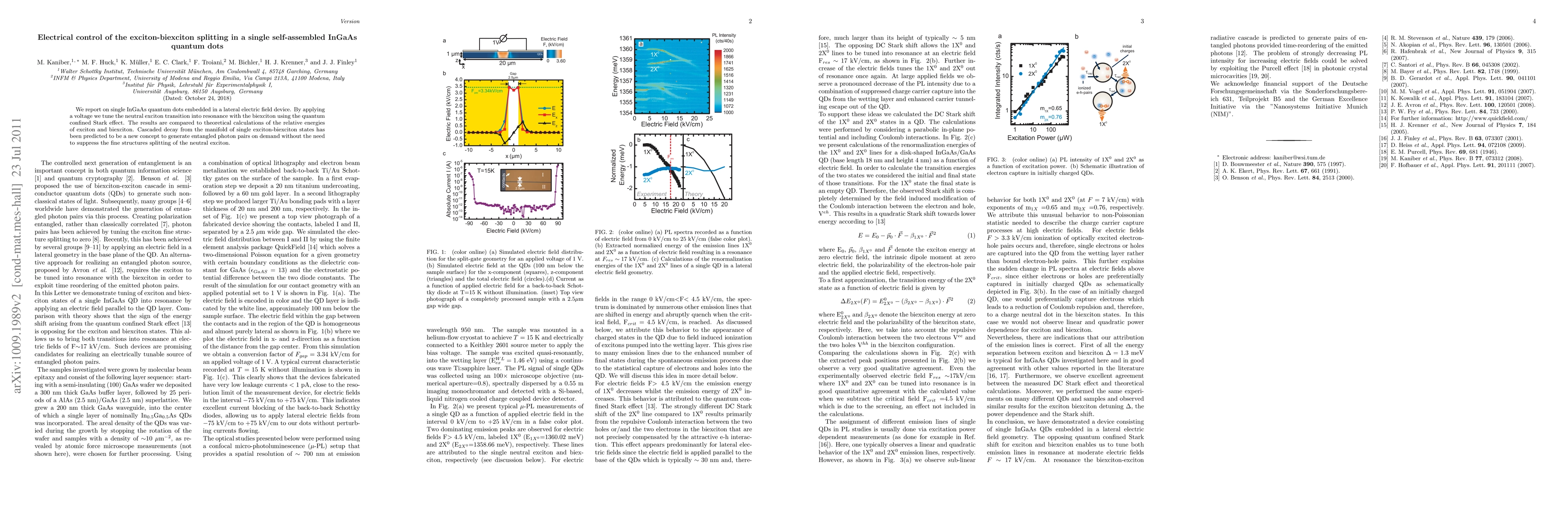 This research demonstrates the electrical tuning of exciton-biexciton splitting in single InGaAs quantum dots via a lateral electric field, achieving resonance through the quantum confined Stark effect. The findings suggest potential for generating entangled photon pairs through cascaded decay without fine structure suppression.