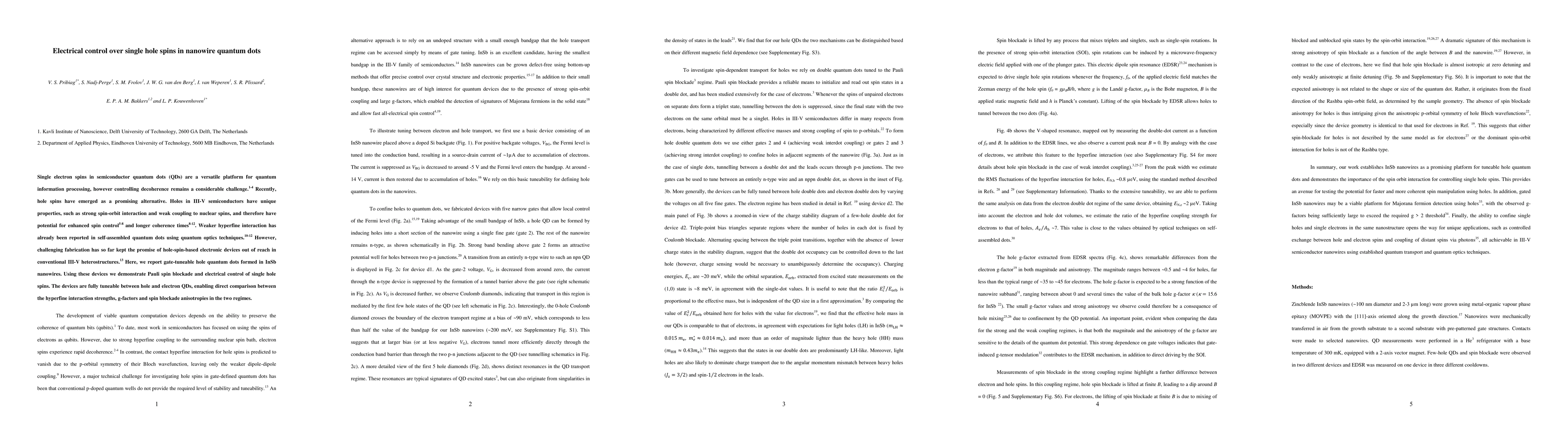 This paper reports the successful fabrication of gate-tuneable hole quantum dots in InSb nanowires, enabling electrical control of single hole spins and demonstrating Pauli spin blockade. The study compares hole and electron quantum dots, highlighting the potential of hole spins for quantum information processing due to their enhanced control and longer coherence times.