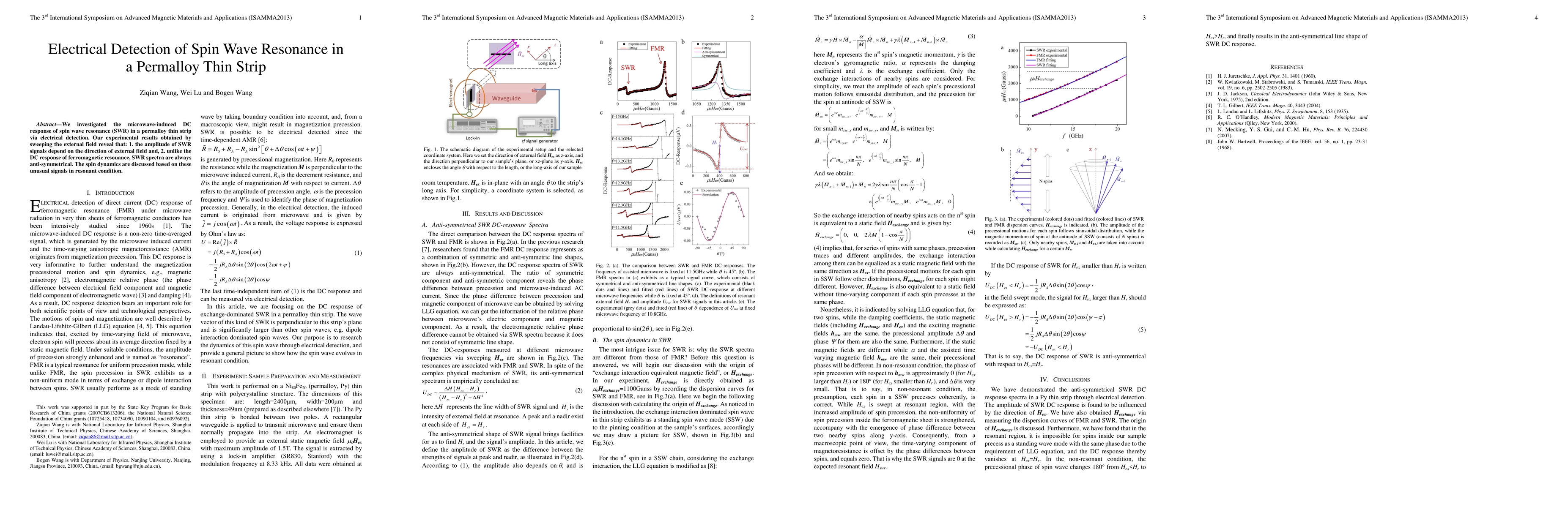 This study investigates the microwave-induced DC response of spin wave resonance in a permalloy thin strip, revealing that SWR signal amplitude varies with external field direction and that SWR spectra are anti-symmetrical unlike conventional ferromagnetic resonance. The findings provide insights into the spin dynamics in resonant conditions.