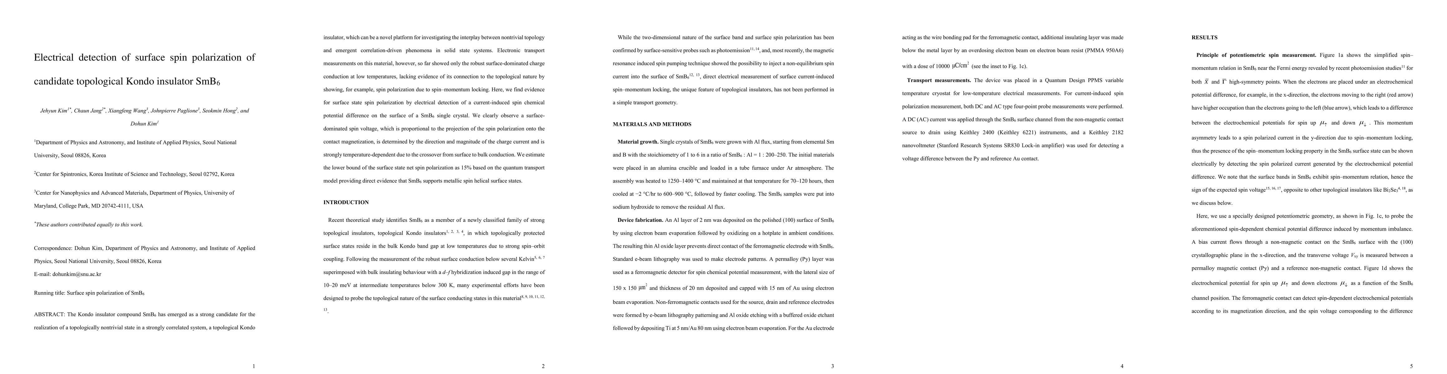 This paper reports electrical detection of surface spin polarization in SmB6, a topological Kondo insulator, revealing a spin voltage proportional to spin polarization and current direction. The findings provide direct evidence for metallic spin helical surface states, supporting SmB6 as a platform for studying topological and correlation-driven phenomena.