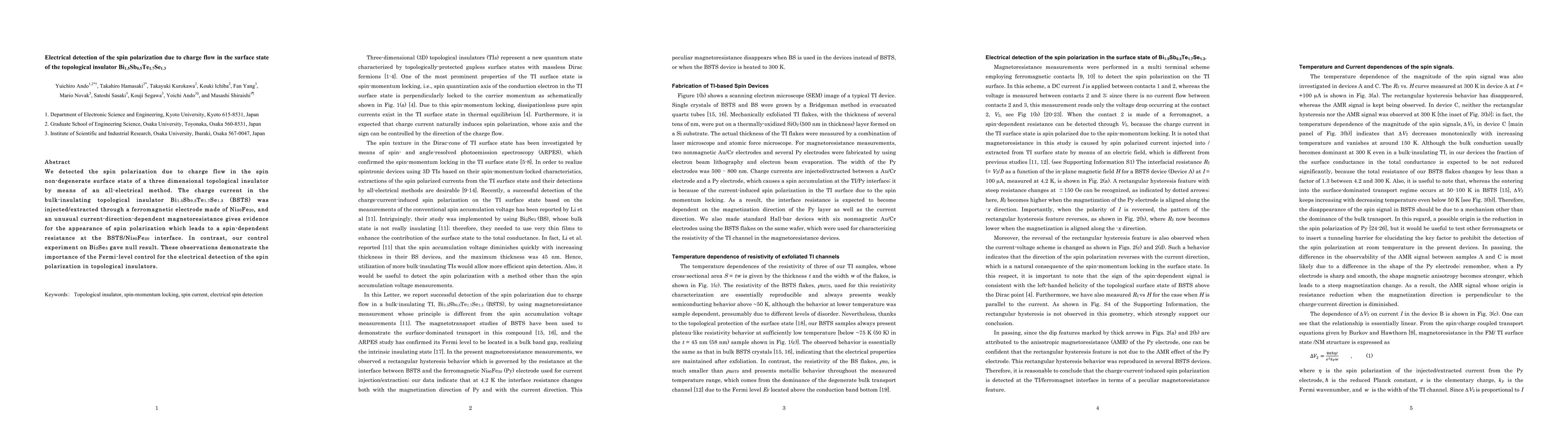 This paper reports the electrical detection of spin polarization in the surface state of the topological insulator Bi1.5Sb0.5Te1.7Se1.3 using a ferromagnetic electrode, revealing a current-direction-dependent magnetoresistance indicative of spin-dependent resistance at the BSTS/Ni80Fe20 interface. Control experiments on Bi2Se3 showed no such effect, highlighting the significance of Fermi-level control for detecting spin polarization in topological insulators.