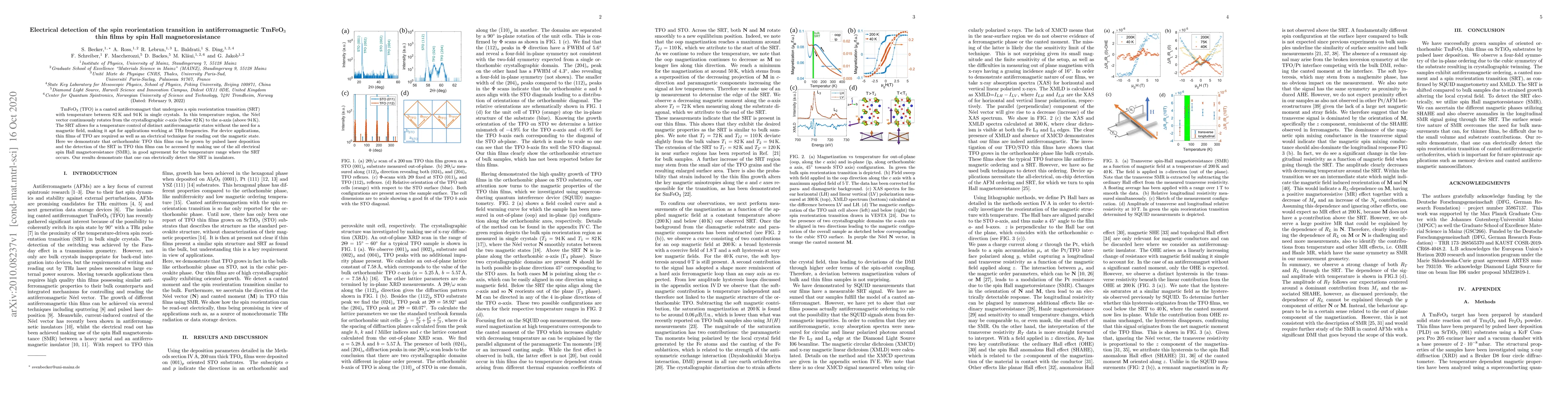 TmFeO$_3$ (TFO) is a canted antiferromagnet that undergoes a spin reorientation transition (SRT) with temperature between 82 K and 94 K in single crystals. In this temperature region, the N\'eel vector continuously rotates from the crystallographic $c$-axis (below 82 K) to the $a$-axis (above 94 K). The SRT allows for a temperature control of distinct antiferromagnetic states without the need for a magnetic field, making it apt for applications working at THz frequencies. For device applications, thin films of TFO are required as well as an electrical technique for reading out the magnetic state. Here we demonstrate that orthorhombic TFO thin films can be grown by pulsed laser deposition and the detection of the SRT in TFO thin films can be accessed by making use of the all electrical spin Hall magnetoresistance (SMR), in good agreement for the temperature range where the SRT occurs. Our results demonstrate that one can electrically detect the SRT in insulators.