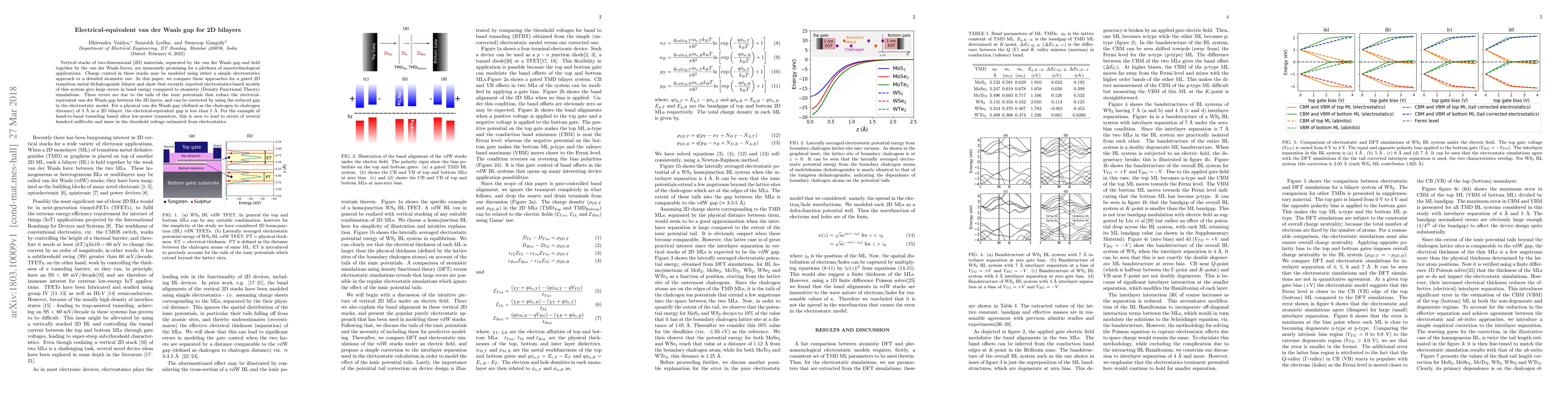 Vertical stacks of two-dimensional (2D) materials, separated by the van der Waals gap and held together by the van der Waals forces, are immensely promising for a plethora of nanotechnological applications. Charge control in these stacks may be modeled using either a simple electrostatics approach or a detailed atomistic one. In this paper, we compare these approaches for a gated 2D transition metal dichalcogenide bilayer and show that recently reported electrostatics-based models of this system give large errors in band energy compared to atomistic (Density Functional Theory) simulations. These errors are due to the tails of the ionic potentials that reduce the electrical-equivalent van der Waals gap between the 2D layers, and can be corrected by using the reduced gap in the electrostatic model. For a physical van der Waals gap (defined as the chalcogen to chalcogen distance) of 3 $\mathrm{\AA}$ in a 2D bilayer, the electrical-equivalent gap is less than 1 $\mathrm{\AA}$. For the example of band-to-band tunneling based ultra low-power transistors, this is seen to lead to errors of several hundred millivolts and more in the threshold voltage estimated from electrostatics.