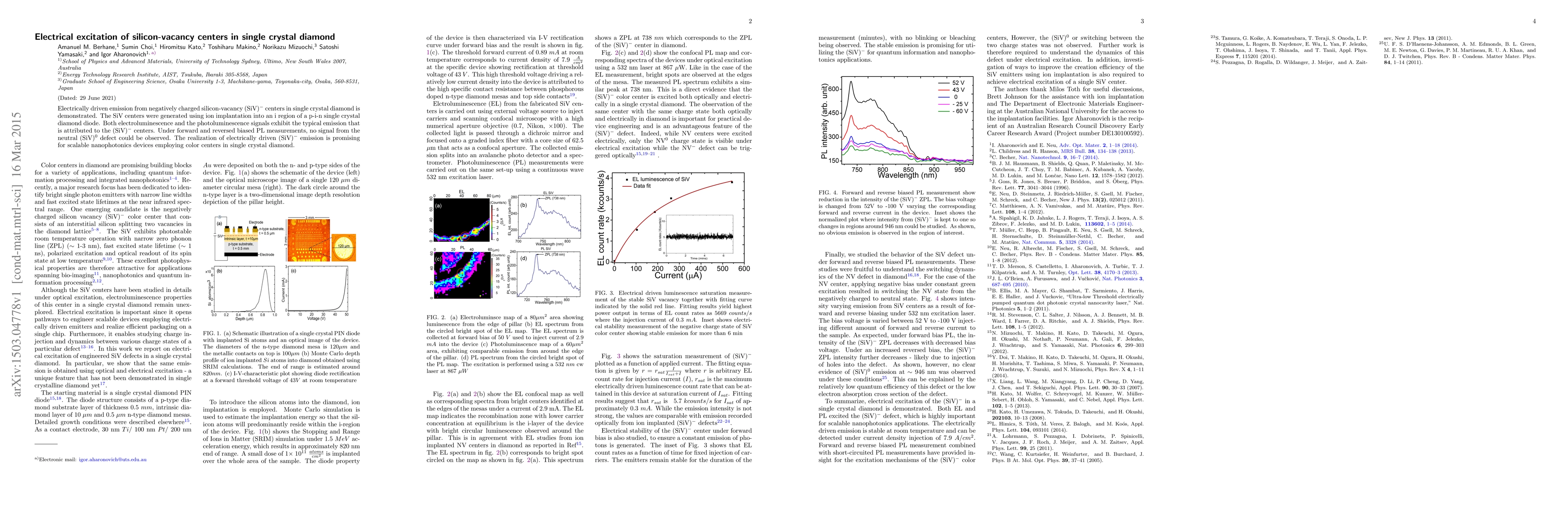 This paper demonstrates electrically driven emission from negatively charged silicon-vacancy (SiV-) centres in single crystal diamond, achieved via ion implantation in a p-i-n diode. Both electroluminescence and photoluminescence show typical SiV- centre emissions, highlighting potential for scalable nanophotonic devices.