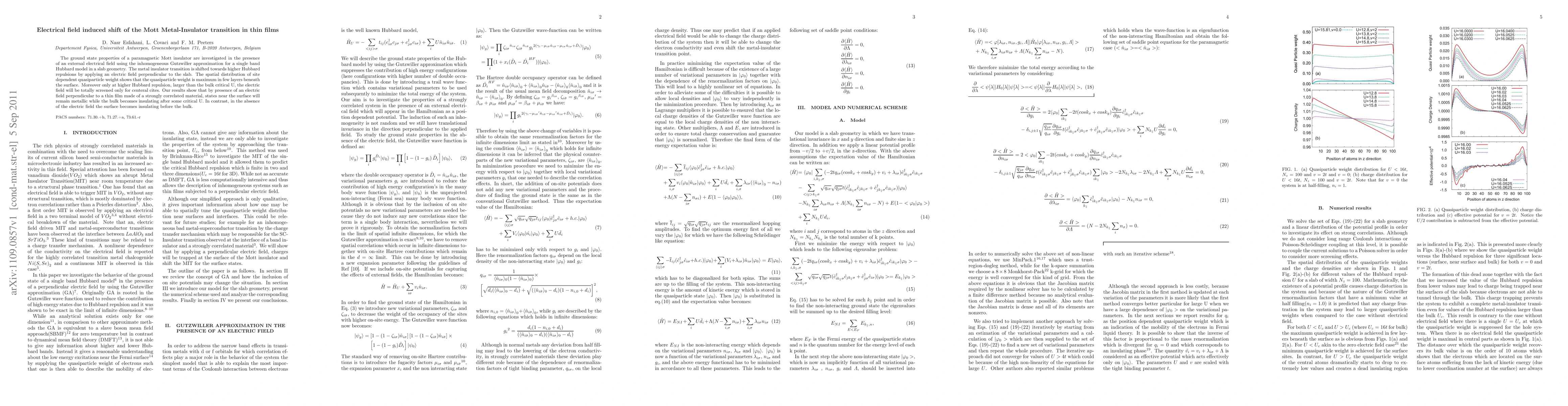 This study investigates how an external electrical field shifts the Mott Metal-Insulator transition in thin films of paramagnetic Mott insulators, revealing that the transition occurs at higher Hubbard repulsions when an electric field is applied. The surface layers remain metallic while the bulk becomes insulating under these conditions.