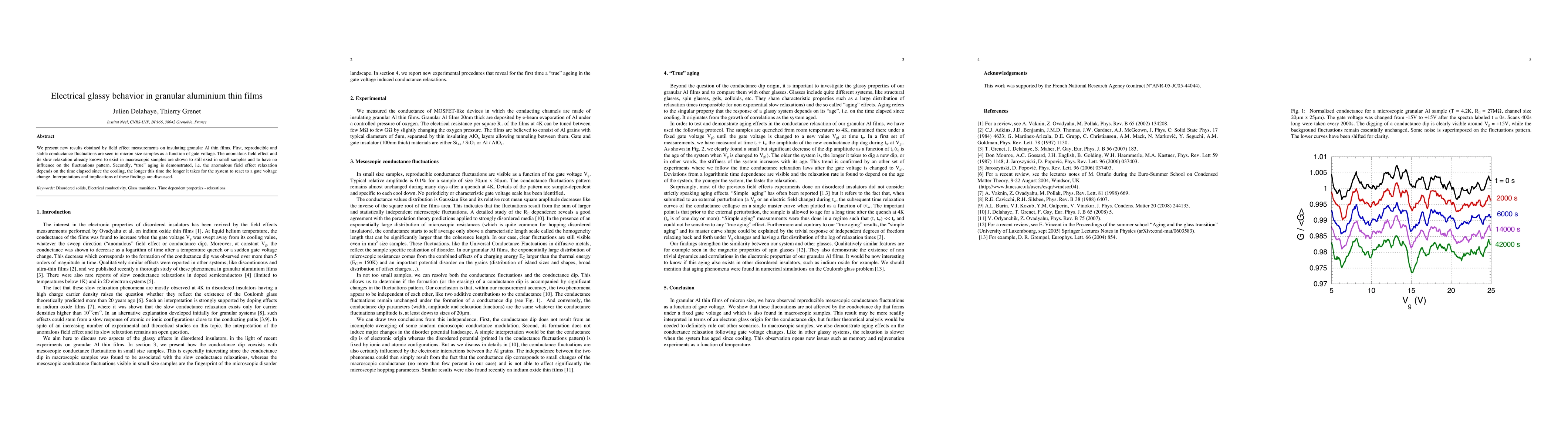 We present new results obtained by field effect measurements on insulating granular Al thin films. First, reproducible and stable conductance fluctuations are seen in micron size samples as a function of gate voltage. The anomalous field effect and its slow relaxation already known to exist in macroscopic samples are shown to still exist in small samples and to have no influence on the fluctuations pattern. Secondly, "true" aging is demonstrated, i.e. the anomalous field effect relaxation depends on the time elapsed since the cooling, the longer this time the longer it takes for the system to react to a gate voltage change. Interpretations and implications of these findings are discussed.