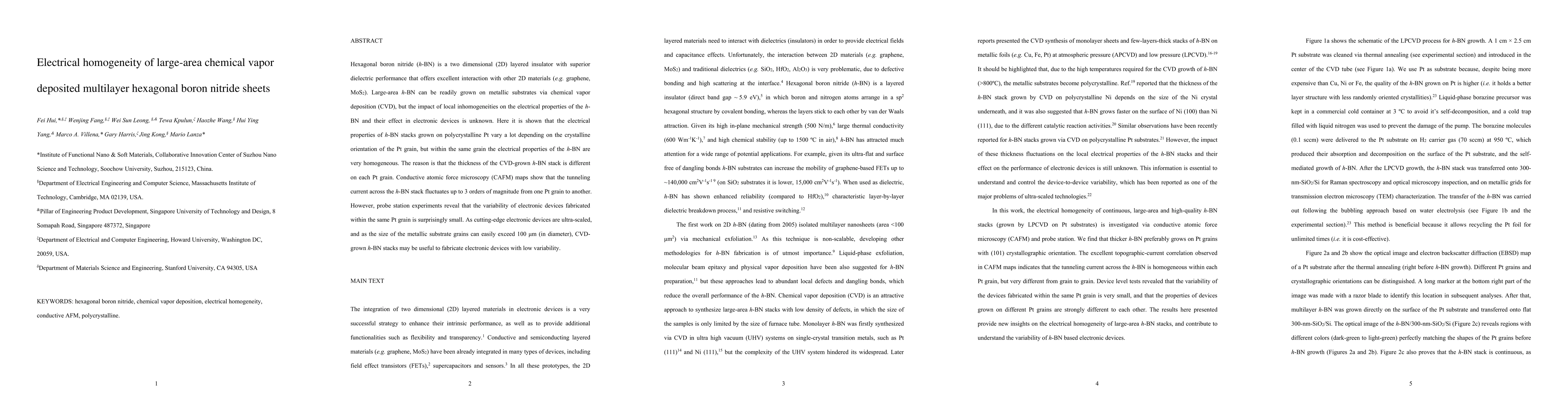 This paper investigates the electrical homogeneity of large-area chemical vapor deposited hexagonal boron nitride (h-BN) multilayers on polycrystalline Pt. Despite significant variations in tunneling current across different Pt grains due to varying h-BN thickness, electronic properties within the same Pt grain are remarkably uniform, suggesting potential for low-variability electronic devices.