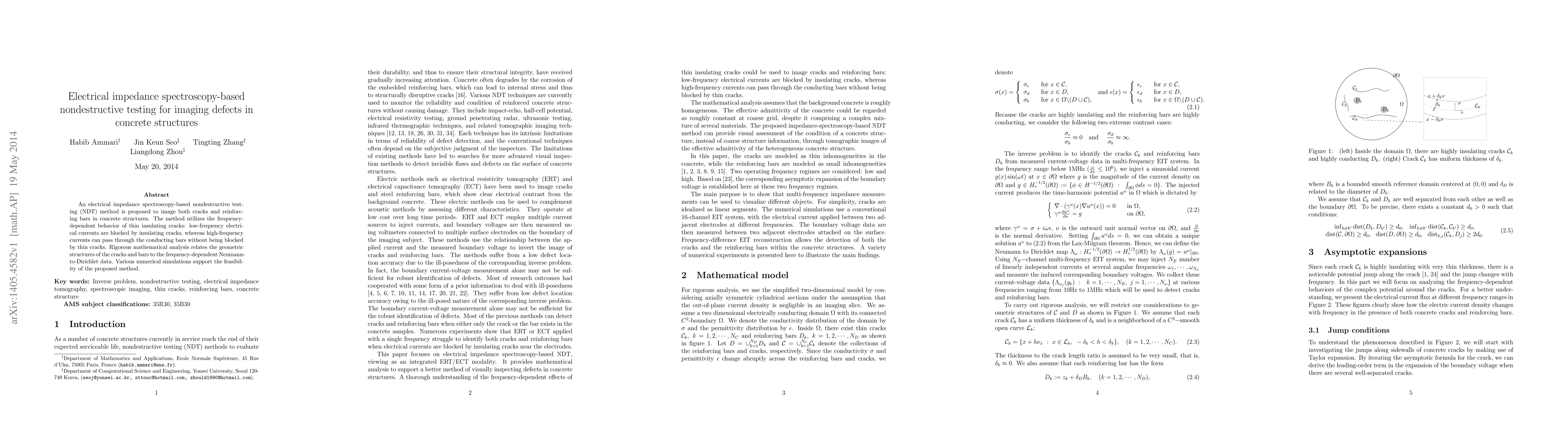 This paper proposes an electrical impedance spectroscopy-based nondestructive testing method to image defects in concrete structures, distinguishing between cracks and reinforcing bars using frequency-dependent electrical current behavior. Numerical simulations validate the method's feasibility.