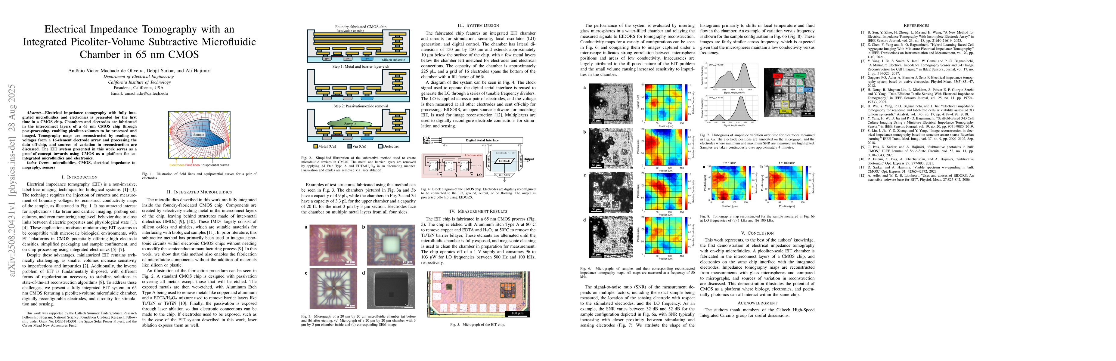 Electrical impedance tomography with fully integrated microfluidics and electronics is presented for the first time in a CMOS chip. Chambers and electrodes are fabricated in the interconnect layers of a 65 nm CMOS chip through post-processing, enabling picoliter-volumes to be processed and imaged. Tomography maps are reconstructed by reading out voltages from a 16-element electrode array and processing the data off-chip, and sources of variation in reconstruction are discussed. The EIT system presented in this work serves as a proof-of-concept towards using CMOS as a platform for co-integrated microfluidics and electronics.
