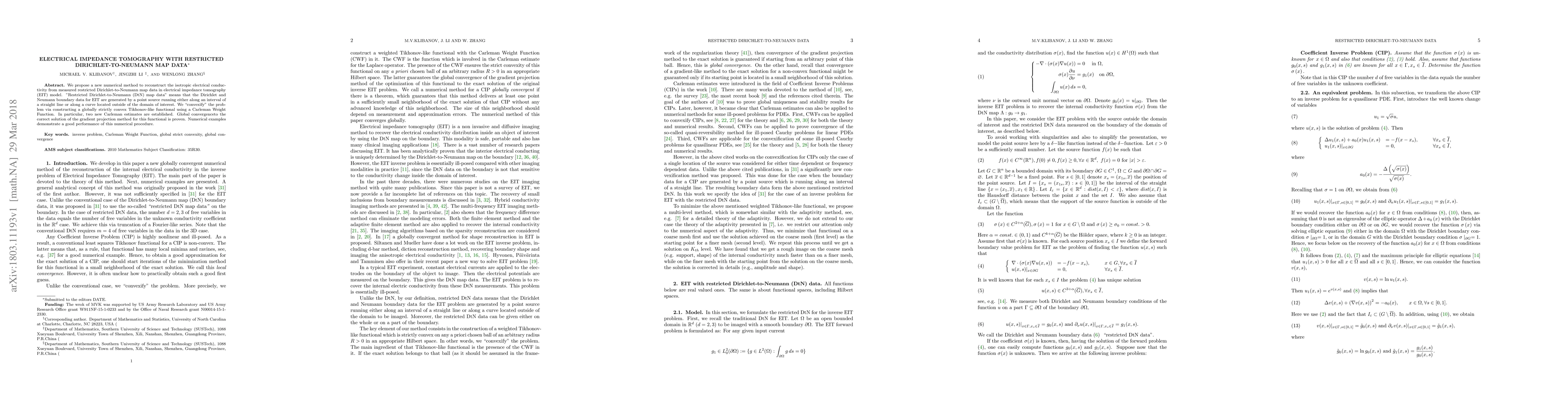 We propose a new numerical method to reconstruct the isotropic electrical conductivity from measured restricted Dirichlet-to-Neumann map data in electrical impedance tomography (EIT) model. "Restricted Dirichlet-to-Neumann (DtN) map data" means that the Dirichlet and Neumann boundary data for EIT are generated by a point source running either along an interval of a straight line or along a curve located outside of the domain of interest. We "convexify" the problem via constructing a globally strictly convex Tikhonov-like functional using a Carleman Weight Function. In particular, two new Carleman estimates are established. Global convergenceto the correct solution of the gradient projection method for this functional is proven. Numerical examples demonstrate a good performance of this numerical procedure.