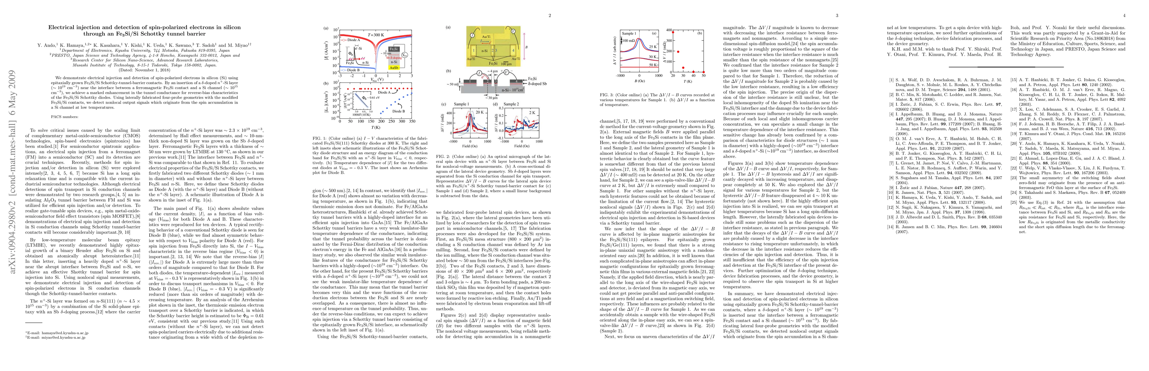 The study demonstrates electrical injection and detection of spin-polarized electrons in silicon via Fe_3Si/Si Schottky-tunnel barriers, enhanced by a delta-doped n^+-Si layer, and confirms spin accumulation through nonlocal output signals at low temperatures.