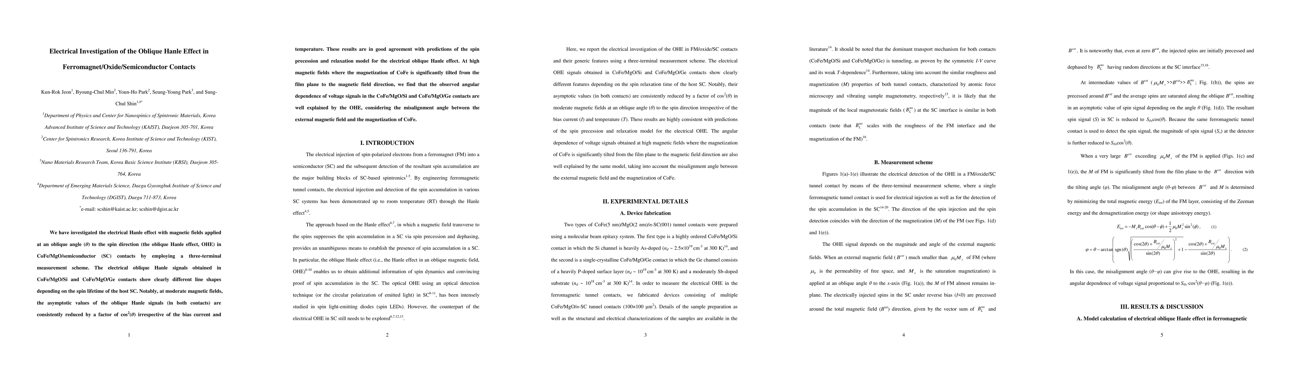 This paper investigates the electrical oblique Hanle effect in ferromagnet/oxide/semiconductor contacts using a three-terminal measurement scheme. The study reveals distinct line shapes in CoFe/MgO/Si and CoFe/MgO/Ge contacts, correlating with the spin lifetime, and shows that the effect is consistently reduced by cos^2(θ) at moderate fields, aligning with theoretical models of spin precession and relaxation.