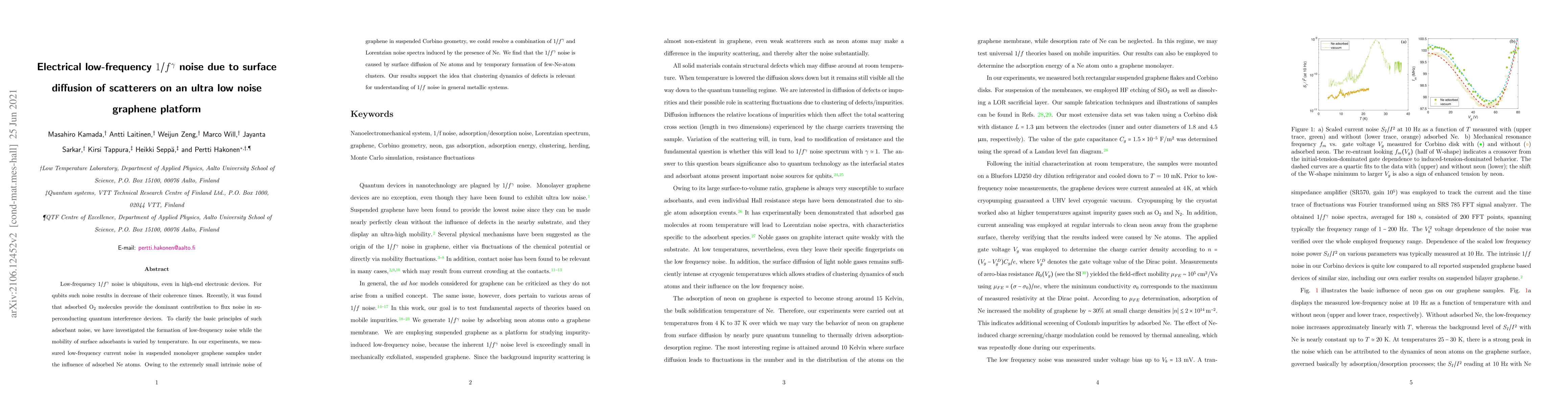 Low-frequency $1/f^{\gamma}$ noise is ubiquitous, even in high-end electronic devices. For qubits such noise results in decrease of their coherence times. Recently, it was found that adsorbed O$_2$ molecules provide the dominant contribution to flux noise in superconducting quantum interference devices. To clarify the basic principles of such adsorbant noise, we have investigated the formation of low-frequency noise while the mobility of surface adsorbants is varied by temperature. In our experiments, we measured low-frequency current noise in suspended monolayer graphene samples under the influence of adsorbed Ne atoms. Owing to the extremely small intrinsic noise of graphene in suspended Corbino geometry, we could resolve a combination of $1/f^{\gamma}$ and Lorentzian noise spectra induced by the presence of Ne. We find that the $1/f^{\gamma}$ noise is caused by surface diffusion of Ne atoms and by temporary formation of few-Ne-atom clusters. Our results support the idea that clustering dynamics of defects is relevant for understanding of $1/f$ noise in general metallic systems.