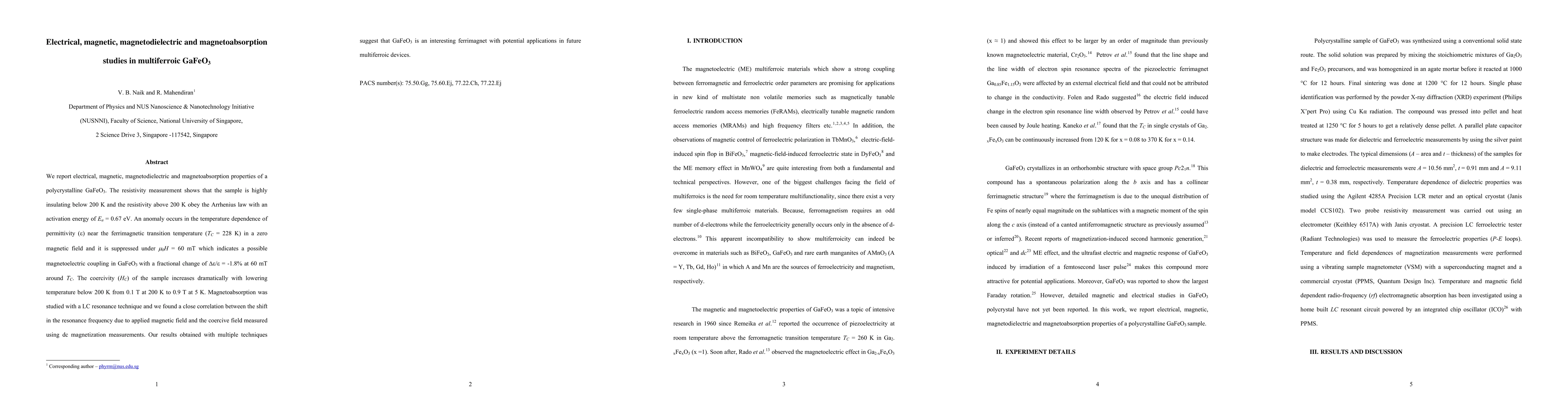 This paper investigates the electrical, magnetic, magnetodielectric, and magnetoabsorption properties of polycrystalline GaFeO3, revealing it as a highly insulating ferrimagnet with potential for multiferroic applications, particularly due to its magnetoelectric coupling and significant magnetoabsorption behavior.