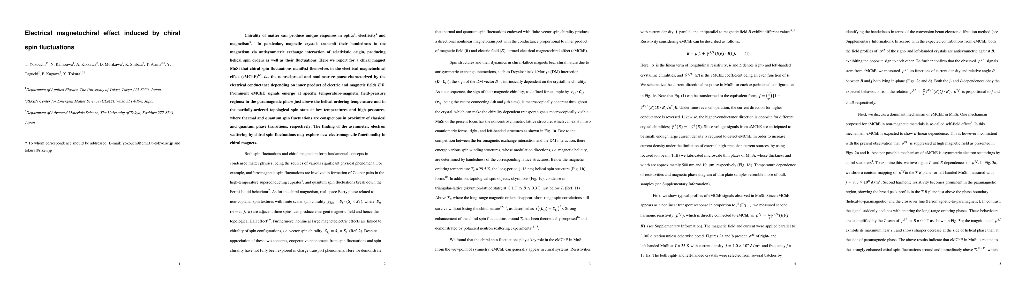 Chirality of matter can produce unique responses in optics, electricity and magnetism. In particular, magnetic crystals transmit their handedness to the magnetism via antisymmetric exchange interaction of relativistic origin, producing helical spin orders as well as their fluctuations. Here we report for a chiral magnet MnSi that chiral spin fluctuations manifest themselves in the electrical magnetochiral effect (eMChE), i.e. the nonreciprocal and nonlinear response characterized by the electrical conductance depending on inner product of electric and magnetic fields $\boldsymbol{E} \cdot \boldsymbol{B}$. Prominent eMChE signals emerge at specific temperature-magnetic field-pressure regions: in the paramagnetic phase just above the helical ordering temperature and in the partially-ordered topological spin state at low temperatures and high pressures, where thermal and quantum spin fluctuations are conspicuous in proximity of classical and quantum phase transitions, respectively. The finding of the asymmetric electron scattering by chiral spin fluctuations may explore new electromagnetic functionality in chiral magnets.